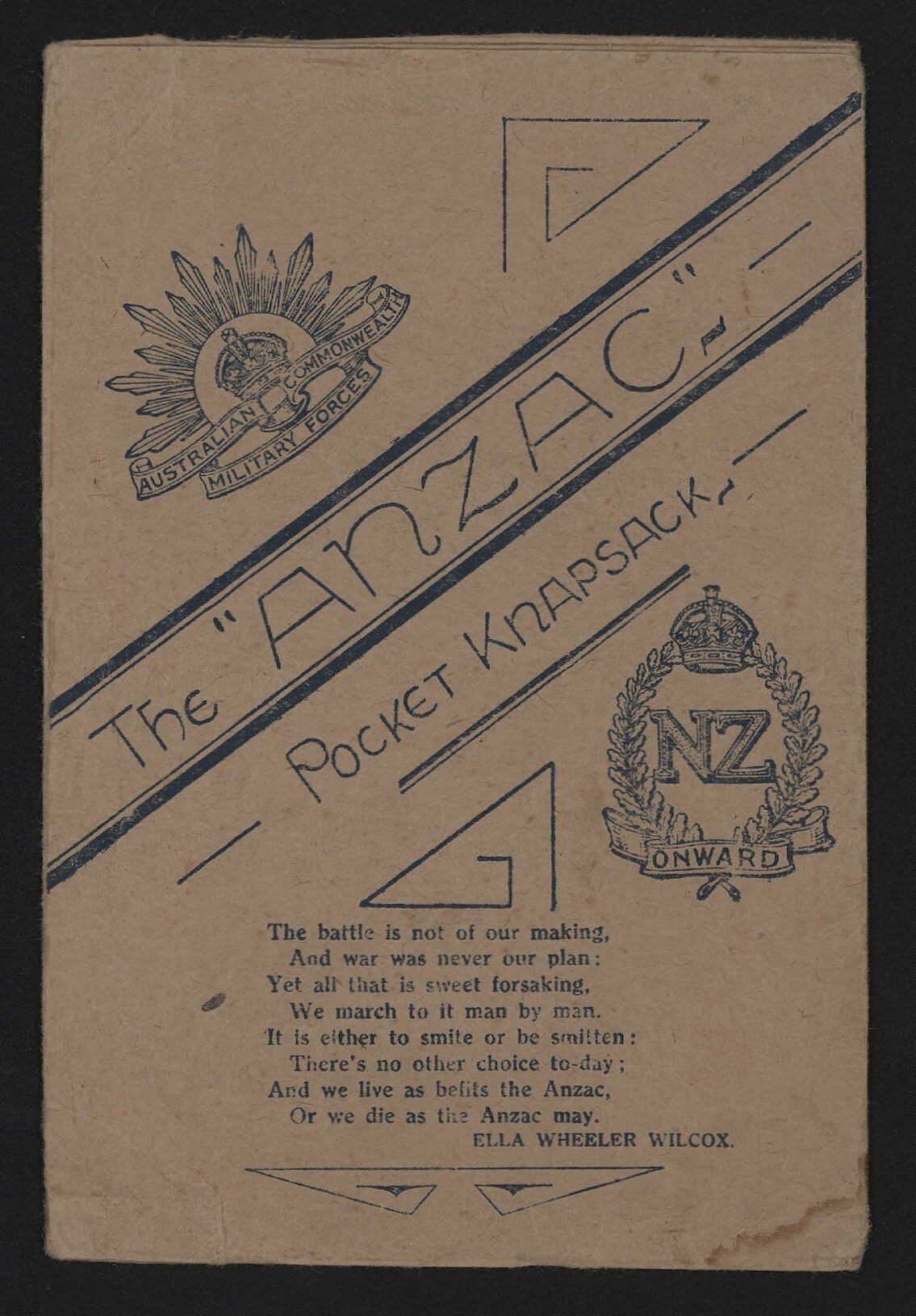 This Anzac Pocket Knapsack, printed in London during the First World War, highlights the emerging identify of Australian and New Zealand Forces as 'Anzac', and enhances our representation of military life, highlighting the culture of communication of soldiers on active duty.