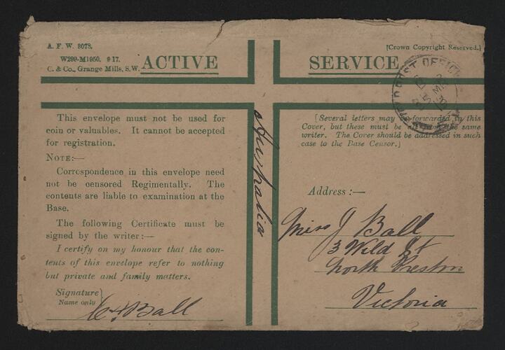 Printed on recto, upper margin: ACTIVE SERVICE Printed on recto, upper lh corner: A.F.W. 3078/ W299-M1950. 917./ C. & Co., Grange Mills, S.W. Handwritten on recto, lower lh corner, black pen: W. Ball Handwritten on recto, rh column, black pen: Miss J Ball/ 3 Wild St/ North Preston/ Victoria Handwritten on in centre column: Australia