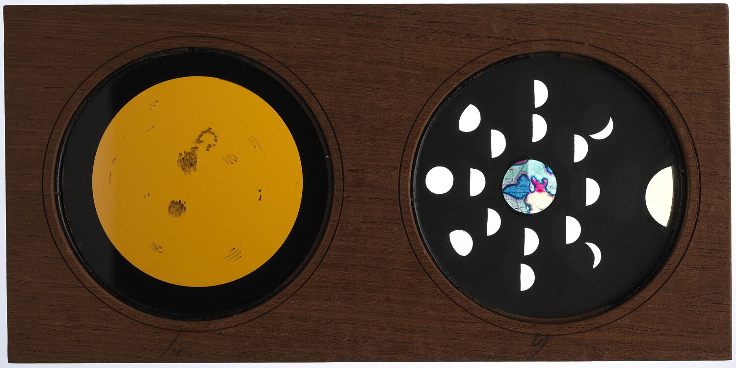 This is a lantern slide consisting of two hand painted glass discs showing the cycle of phases of the Moon in its orbit around Earth, and a picture of the Sun, numbered '6' and '7' respectively. This lantern slide is part of a near-complete set of 19 slides used to illustrate a lantern lecture on astronomy, associated with the slide reading 'Popular Lecture on Astronomy'. This particular set was manufactured in England in approximately 1847, depicting astronomical knowledge about the planets as existed around that date. This set was used in Victoria in the nineteenth century. Precise details about its usage are unknown but equivalent sets were widely used in astronomical lantern lectures in Australia between the 1840s and 1880s, as can be seen from the synopses of lectures published in newspapers.