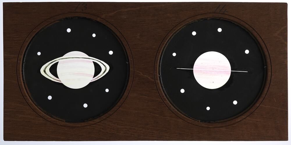 This is a lantern slide consisting of two hand painted glass discs showing Saturn with its ring at a large angle, and Saturn with its ring seen edge on, numbered '13' and '14' respectively. This lantern slide is part of a near-complete set of 19 slides used to illustrate a lantern lecture on astronomy, associated with the slide reading 'Popular Lecture on Astronomy'. This particular set was manufactured in England in approximately 1847, depicting astronomical knowledge about the planets as existed around that date. This set was used in Victoria in the nineteenth century. Precise details about its usage are unknown but equivalent sets were widely used in astronomical lantern lectures in Australia between the 1840s and 1880s, as can be seen from the synopses of lectures published in newspapers.