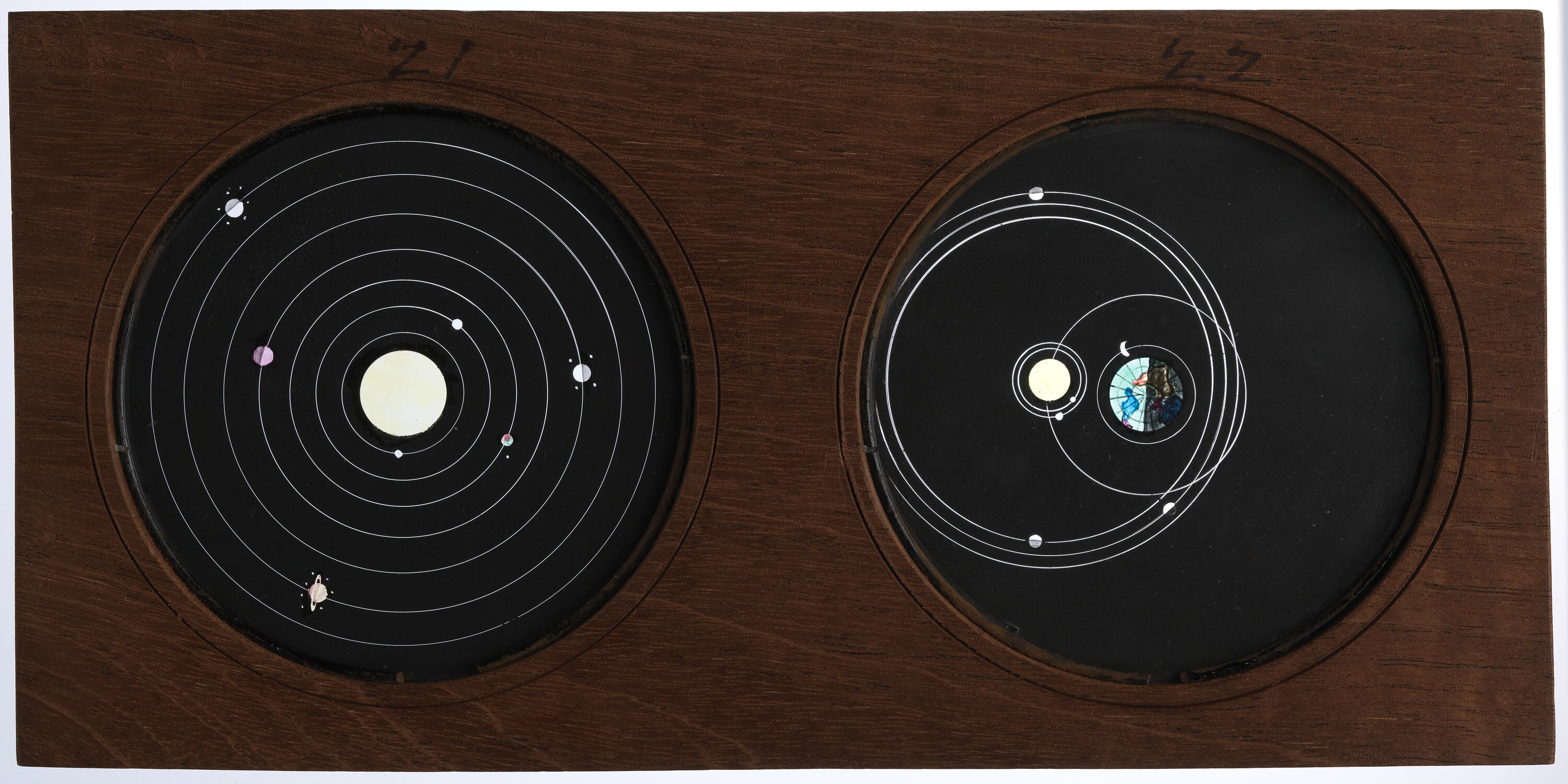 The slide consists of two astronomical diagrams. The diagram on the left glass disc, numbered 21, is of the Sun surrounded by 7 planets and their moons, and their orbits as arranged in the Copernican System of the Solar System, with the planets and moons having perfectly circular orbits. The diagram on the right glass disc, numbered 22, is of the Sun, planets and moons, and their orbits as arranged in the Tychonic System of the Solar System, with the Sun and the Moon orbiting the Earth and all other planets orbiting the Sun.