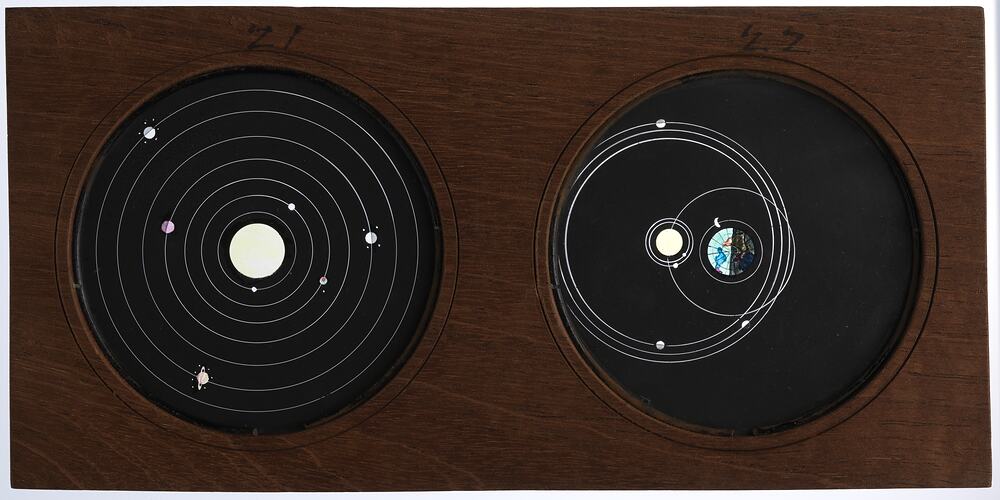 This is a lantern slide consisting of two hand painted glass discs illustrating the Copernican and the Tychonic systems of the planets, numbered '21' and '22' respectively. This lantern slide is part of a near-complete set of 19 slides used to illustrate a lantern lecture on astronomy, associated with the slide reading 'Popular Lecture on Astronomy'. This particular set was manufactured in England in approximately 1847, depicting astronomical knowledge about the planets as existed around that date. This set was used in Victoria in the nineteenth century. Precise details about its usage are unknown but equivalent sets were widely used in astronomical lantern lectures in Australia between the 1840s and 1880s, as can be seen from the synopses of lectures published in newspapers.