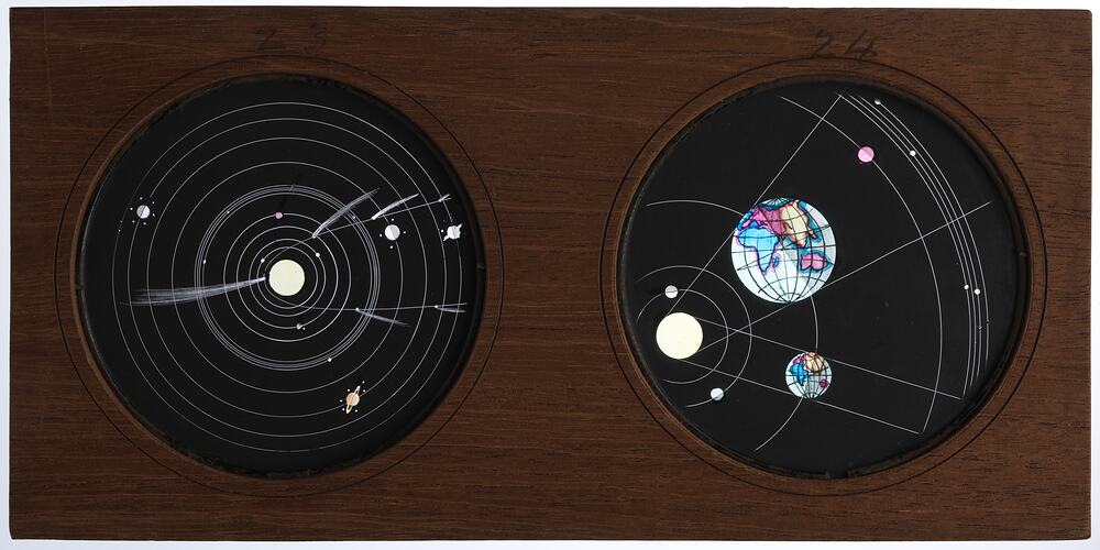 This is a lantern slide consisting of two hand painted glass discs illustrating the Newtonian system of the planets, and an illustration of the Earth's shadow in space as it would be if the Earth were bigger than or the same size as the Sun, numbered '23' and '24' respectively. This lantern slide is part of a near-complete set of 19 slides used to illustrate a lantern lecture on astronomy, associated with the slide reading 'Popular Lecture on Astronomy'. This particular set was manufactured in England in approximately 1847, depicting astronomical knowledge about the planets as existed around that date. This set was used in Victoria in the nineteenth century. Precise details about its usage are unknown but equivalent sets were widely used in astronomical lantern lectures in Australia between the 1840s and 1880s, as can be seen from the synopses of lectures published in newspapers.