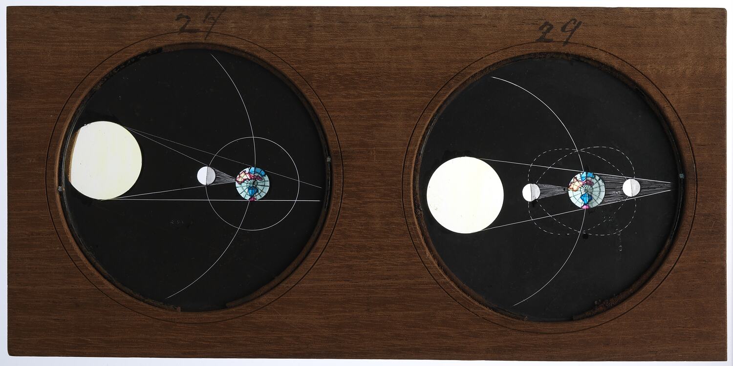 This is a lantern slide consisting of two hand painted glass discs showing a diagram of a total solar eclipse, and an illustration of the orbit of the Moon around the Earth, numbered '27' and '29' respectively. This lantern slide is part of a near-complete set of 19 slides used to illustrate a lantern lecture on astronomy, associated with the slide reading 'Popular Lecture on Astronomy'. This particular set was manufactured in England in approximately 1847, depicting astronomical knowledge about the planets as existed around that date. This set was used in Victoria in the nineteenth century. Precise details about its usage are unknown but equivalent sets were widely used in astronomical lantern lectures in Australia between the 1840s and 1880s, as can be seen from the synopses of lectures published in newspapers.