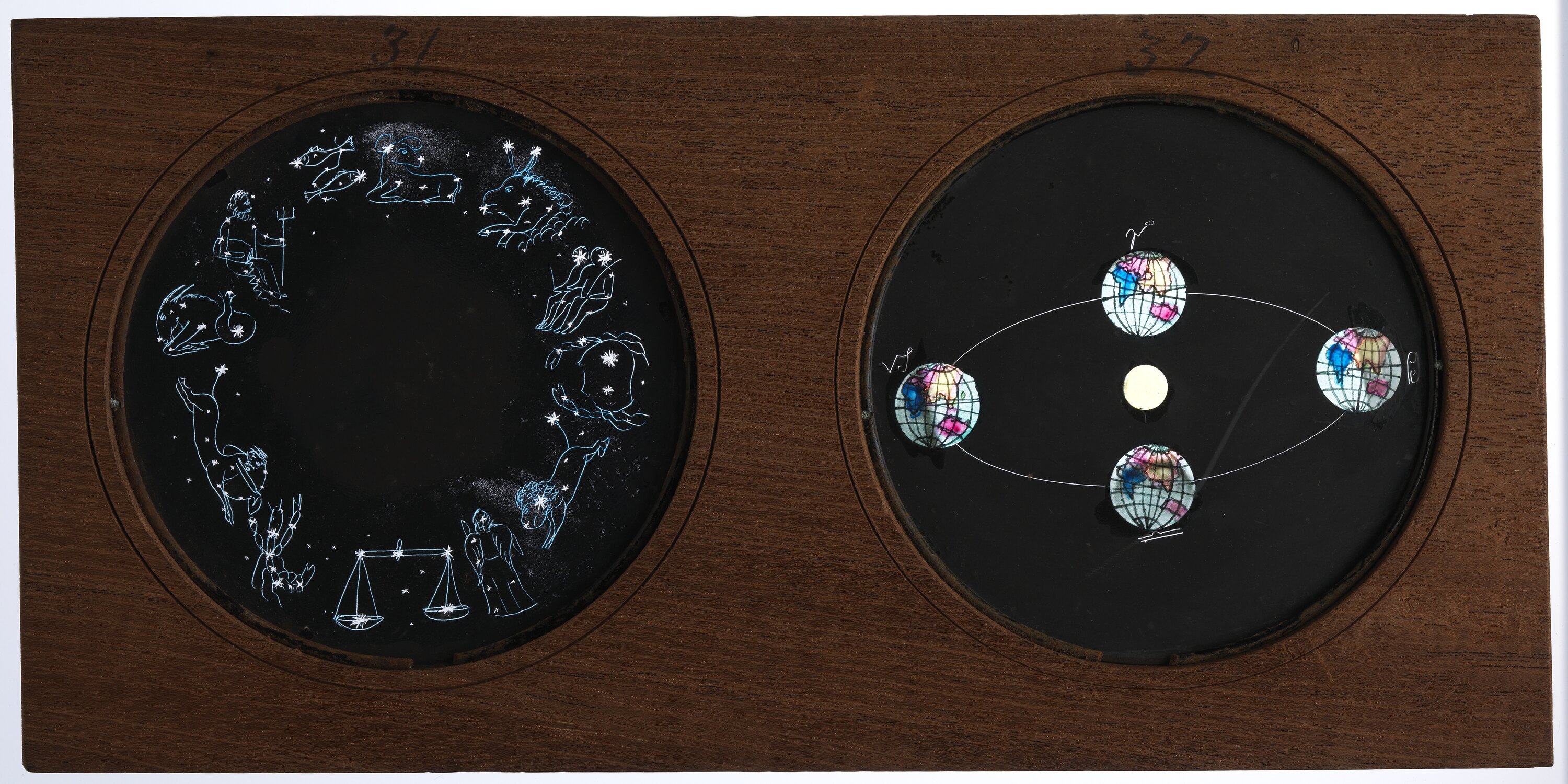 The slide consists of two astronomical diagrams. The diagram on the left glass disc, numbered 31 is of the 12 signs of the zodiac. The signs have been painted around the edges of the glass disc to form a ring shape. The glass disc on the right, numbered 32, is a diagram of Earth in four different locations around the Sun showing how the seasons vary as the angle the Earth's axis makes with the direction to the Sun changes as the Earth orbits the Sun. The points of the orbit corresponding to each season is denoted by the symbols for the zodiacal constellations of Aries, Cancer, Libra and Capricornus.