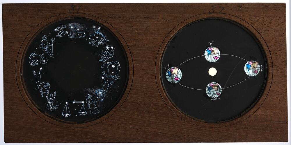 This is a lantern slide consisting of two hand painted glass discs showing the zodiacal constellations, and a diagram showing the position of the Earth in its orbit around the Sun in different seasons, numbered '31' and '32' respectively. This lantern slide is part of a near-complete set of 19 slides used to illustrate a lantern lecture on astronomy, associated with the slide reading 'Popular Lecture on Astronomy'. This particular set was manufactured in England in approximately 1847, depicting astronomical knowledge about the planets as existed around that date. This set was used in Victoria in the nineteenth century. Precise details about its usage are unknown but equivalent sets were widely used in astronomical lantern lectures in Australia between the 1840s and 1880s, as can be seen from the synopses of lectures published in newspapers.