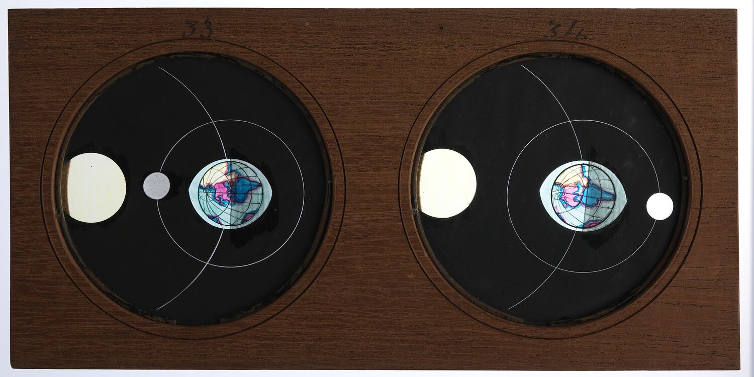 This is a lantern slide consisting of two hand painted glass discs showing two different arrangemnts of the Sun and the Moon with respect to Earth for producing spring tides, numbered '34' and '35' respectively. This lantern slide is part of a near-complete set of 19 slides used to illustrate a lantern lecture on astronomy, associated with the slide reading 'Popular Lecture on Astronomy'. This particular set was manufactured in England in approximately 1847, depicting astronomical knowledge about the planets as existed around that date. This set was used in Victoria in the nineteenth century. Precise details about its usage are unknown but equivalent sets were widely used in astronomical lantern lectures in Australia between the 1840s and 1880s, as can be seen from the synopses of lectures published in newspapers.