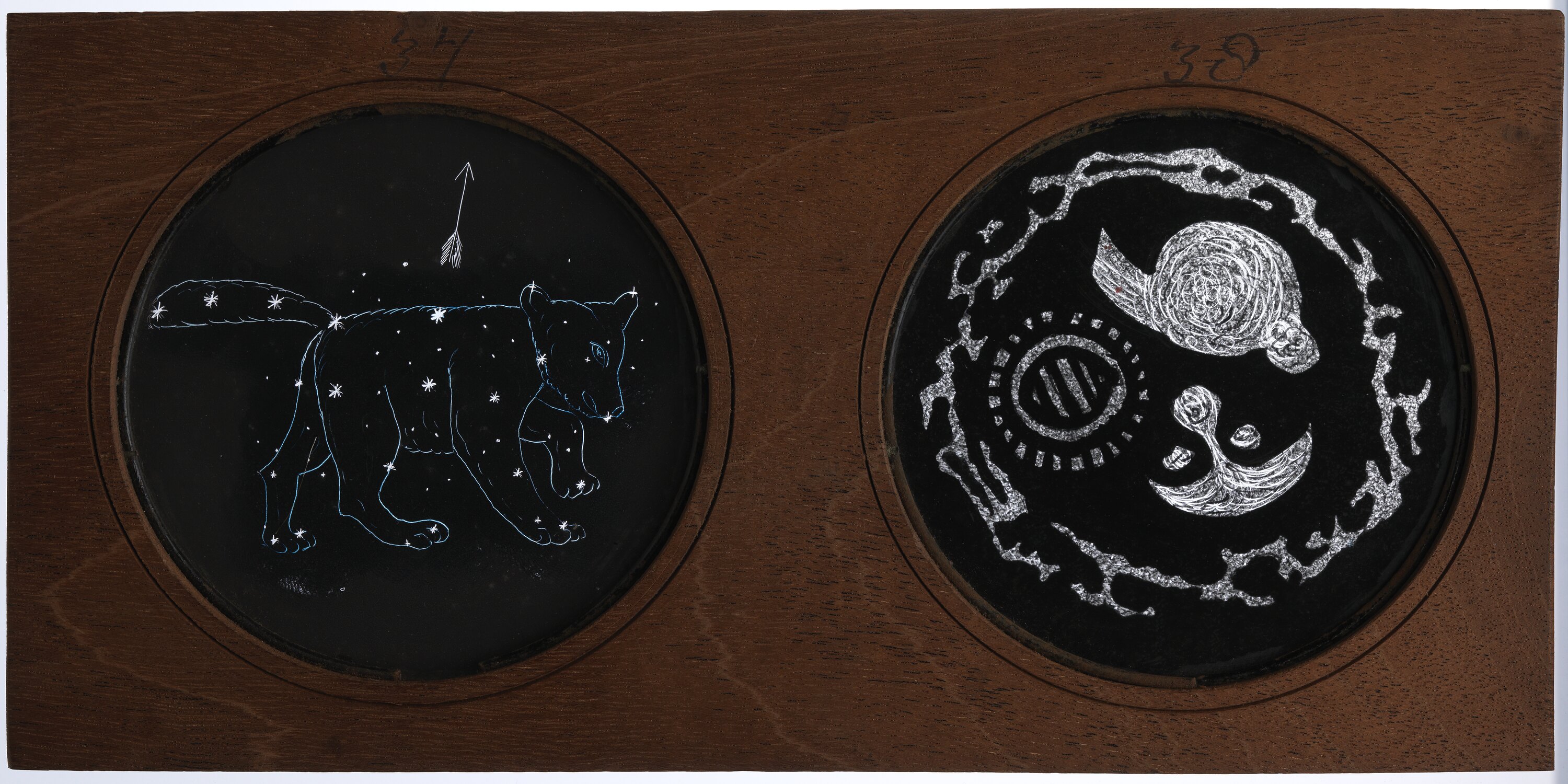 This is a lantern slide consisting of two hand painted glass discs showing the constellation Ursa Major, and drawings of nebulae, numbered '37' and '38' respectively. This lantern slide is part of a near-complete set of 19 slides used to illustrate a lantern lecture on astronomy, associated with the slide reading 'Popular Lecture on Astronomy'. This particular set was manufactured in England in approximately 1847, depicting astronomical knowledge about the planets as existed around that date. This set was used in Victoria in the nineteenth century. Precise details about its usage are unknown but equivalent sets were widely used in astronomical lantern lectures in Australia between the 1840s and 1880s, as can be seen from the synopses of lectures published in newspapers.