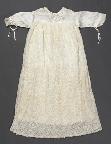 Child's white lace christening dress and matching booty covers worn by Hazel Hathaway for her christening in Coventry, England, circa 1940. It was probably also worn by Hazel's younger sister Merle for her christening, in 1948. The dress was amongst many personal items brought to Australia when the Hathaway family migrated in 1951.