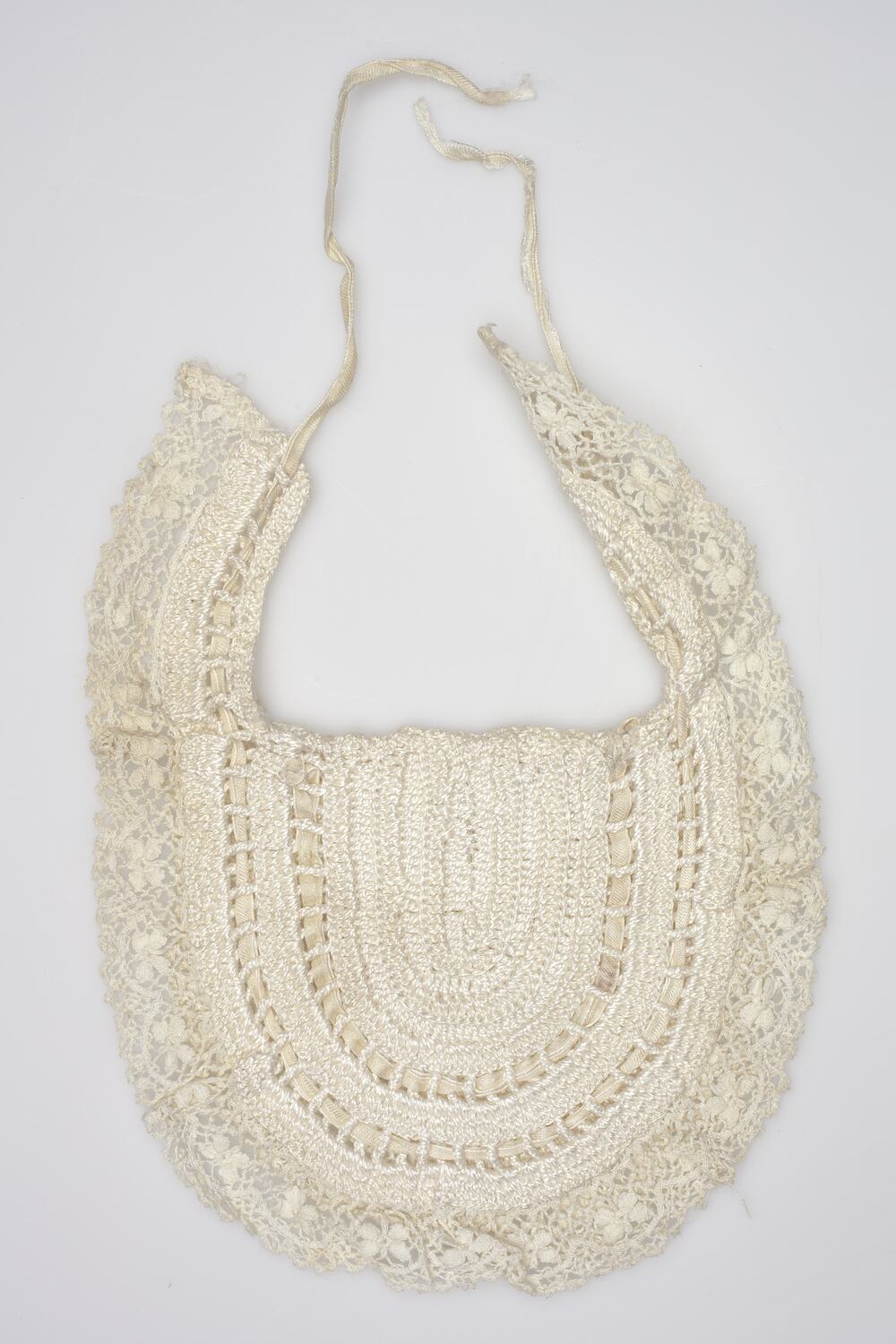 Cream lace with satin ribbon trim.