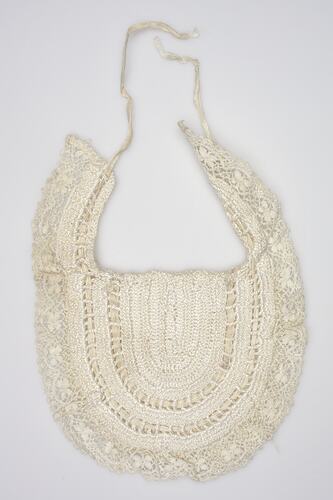 Child's white lace bootie cover worn by Hazel Hathaway for her christening in Coventry, England, circa 1940. They were probably also worn by Hazel's younger sister Merle for her christening, in 1948. The bootie covers were amongst many personal items brought to Australia when the Hathaway family migrated in 1951.