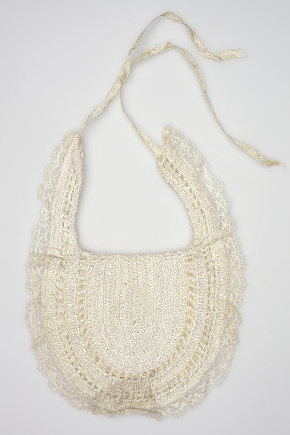 Crocheted bootie cover, cream thread with lace and ribbon trim threaded through the ankle ties. The bootie is crocheted in a 'U' design of repeated rows, with extended crocheted ties, which are threaded with satin ribbon.