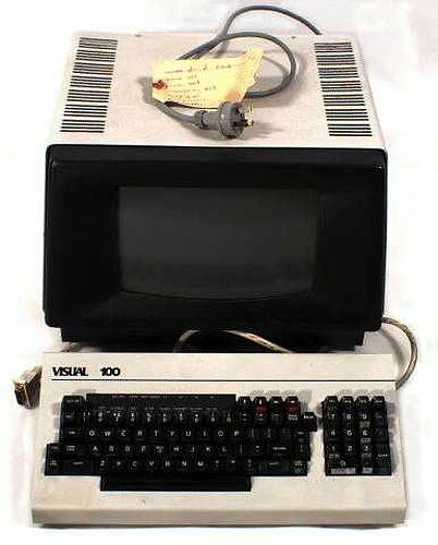 Underneath, manufacturer's plate: " VISUAL / ANDOVER, MA. 01810 / MODEL VISUAL 100 / SERIAL No. 004406100 / POWER 220 V 50 HZ 110W 0.5 AMP / NFPA TYPE II MADE IN U.S.A. " Underneath, sticker: " X-RAY EMISSION / DISPLAY MONITOR CONFORMS TO THE TECHNICAL / REQUIREMENTS OF D.H.H.S. RULES 21 CFR - SUB- / CHAPTER J APPLICABLE AT DATE OF MANUFACTURE / DATE OF MANUFACTURE: NOV 17 1981 / ZENITH RADIO CORP. / CHICAGO, ILL. 60639 " On top of keyboard, black: " VISUAL 100 "