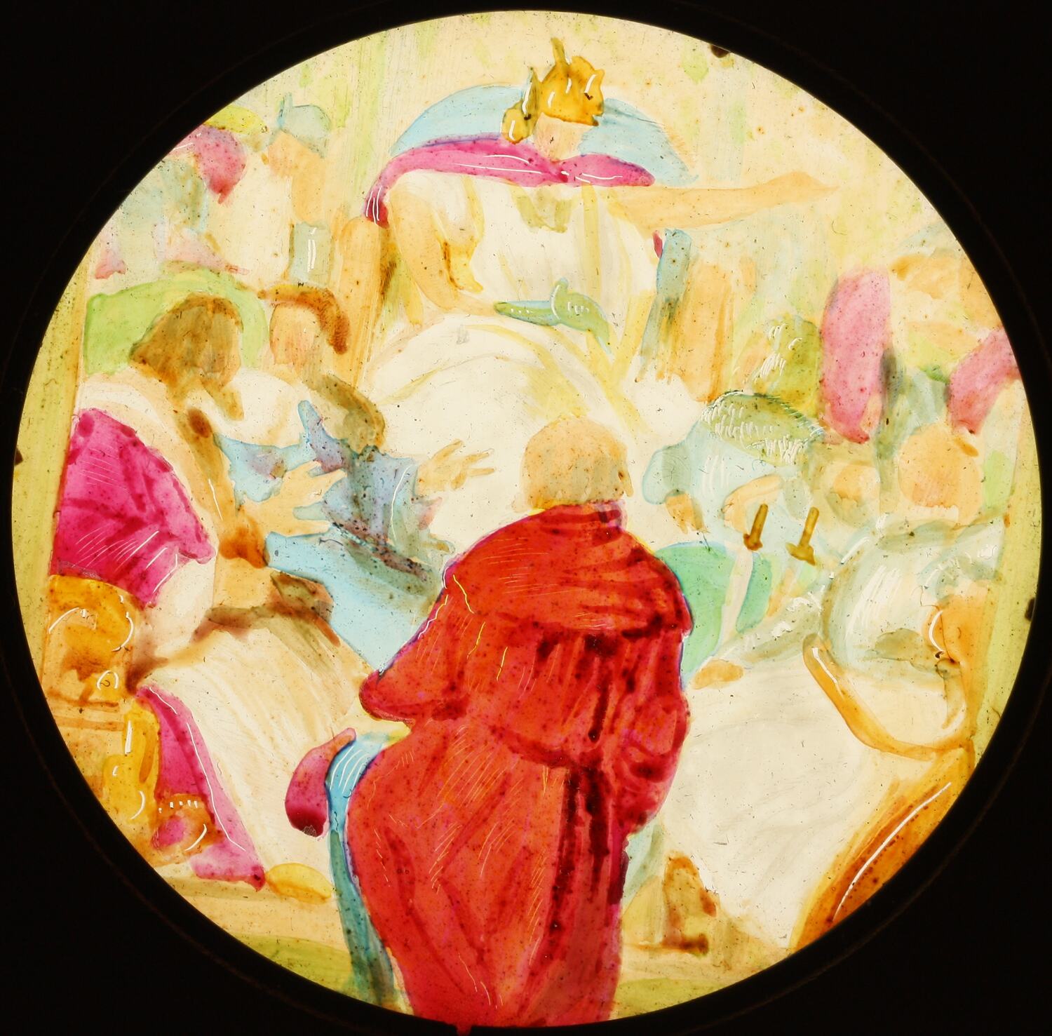 Painted lantern slide depicting man in a red cape sitting in front of a group of men. He had been sent to the camp of Emmanuel, son of Shaddai (Almighty), who led the campaign to reclaim the fictional town of Mansoul. One of a series of 12 printed lantern slides depicting the story of The Holy War, originally written in 1682 by John Bunyan.