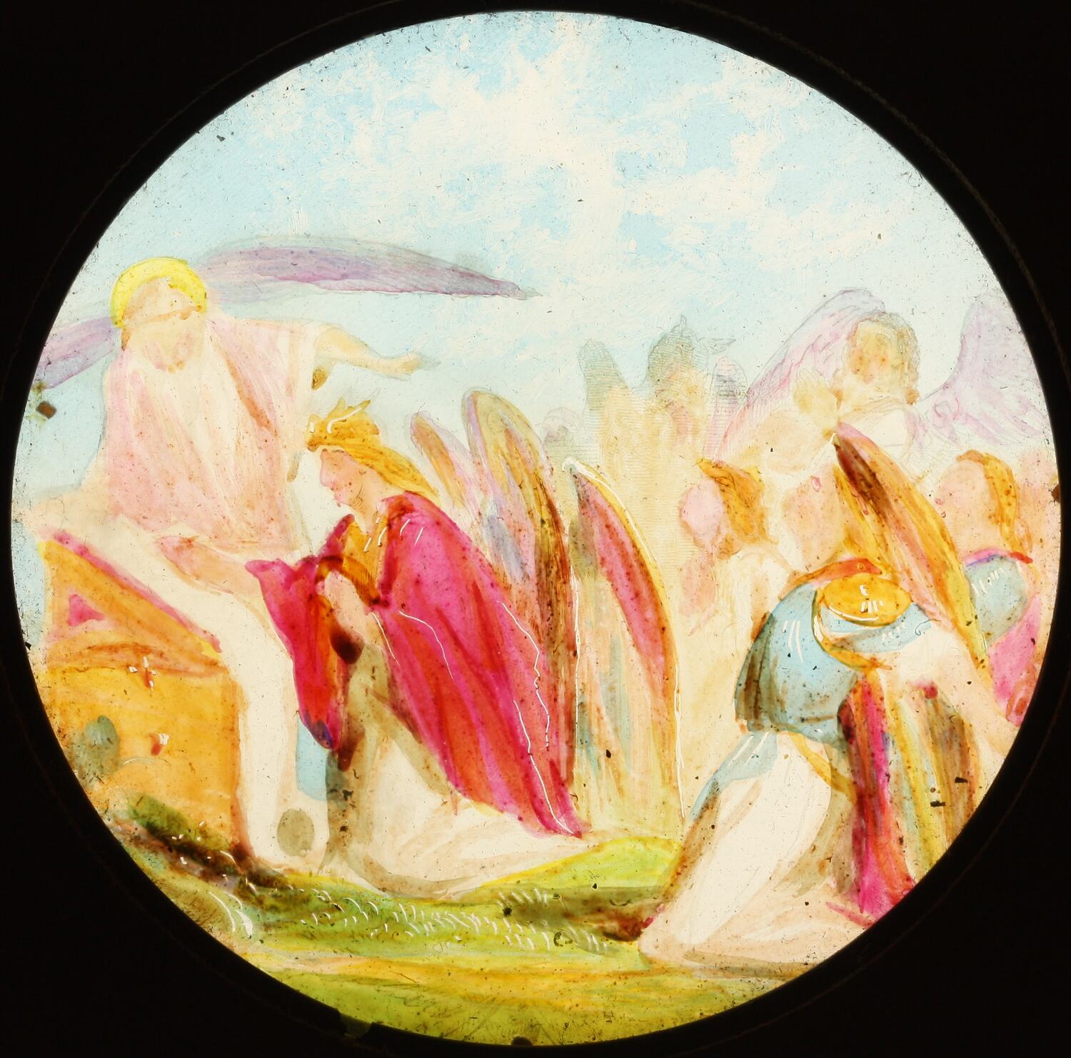 Painted lantern slide depicting a winged man writing in front of an angel: 'The Captain's Petition to Shaddai'. Shaddai is sovereign of the universe and creator of the fictional town of Mansoul. One of a series of 12 printed lantern slides depicting the story of The Holy War, originally written in 1682 by John Bunyan.