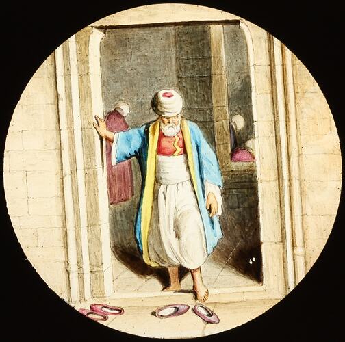 Lantern slide depicting a man in Arabic-style dress putting his shoes on.
