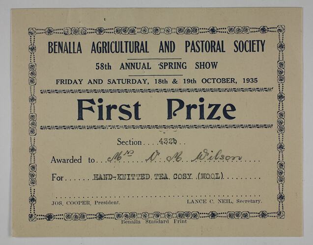 Front: " BENALLA AGRICULTURAL AND PASTORAL SOCIETY / 58th ANNUAL SPRING SHOW / FRIDAY AND SATURDAY, 18th & 19th OCTOBER, 1935 / First Prize / Section 432b / Awarded to Mrs V. M. Wilson / For HAND-KNITTED TEA COSY (WOOL) / JOS. COOPER, President. LANCE C. NEIL, Secretary. / Benalla Standard Print " Reverse: " KNITTED BIRD TEA COSY "