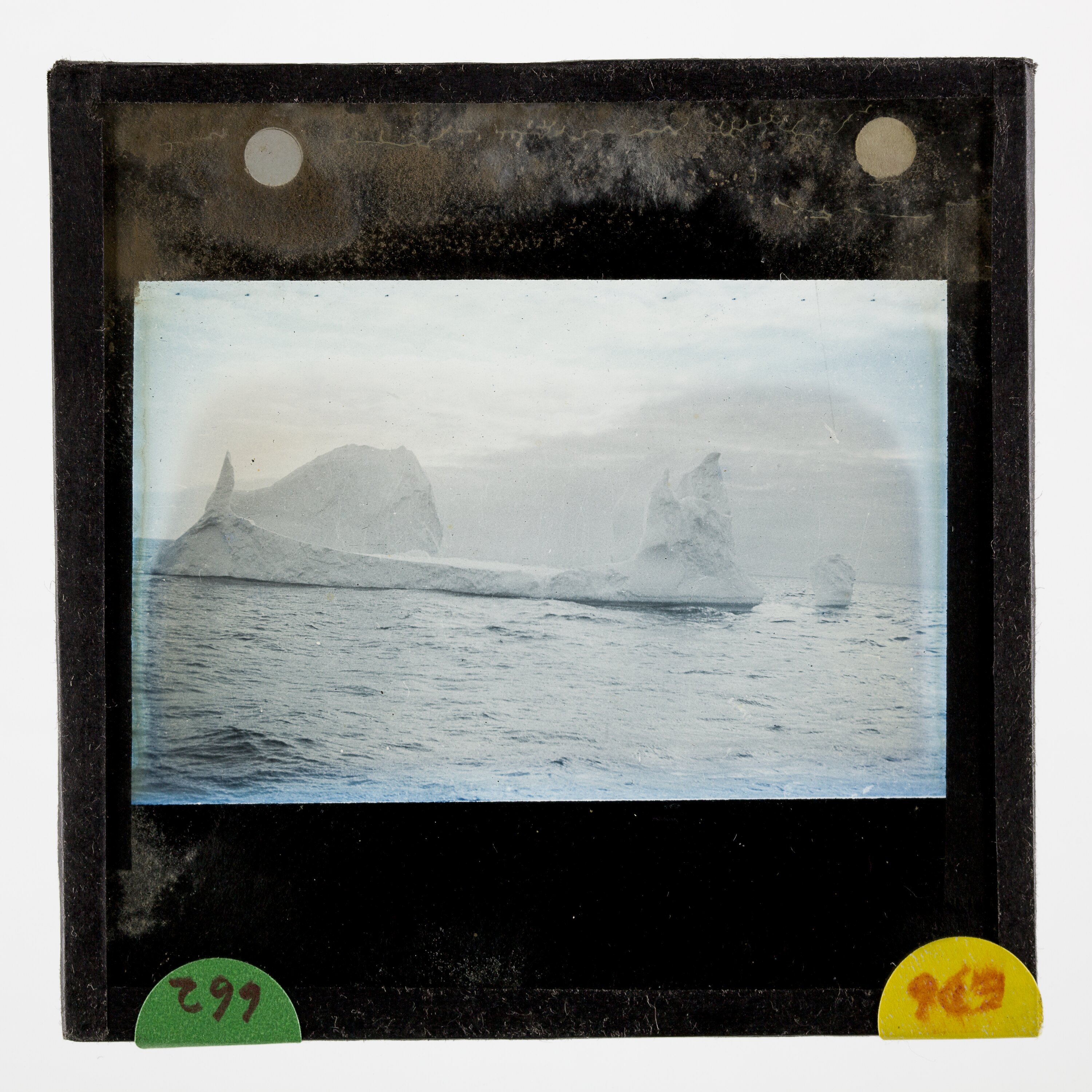 Lantern slide of an icberg with two peaks, one at either end of its base.