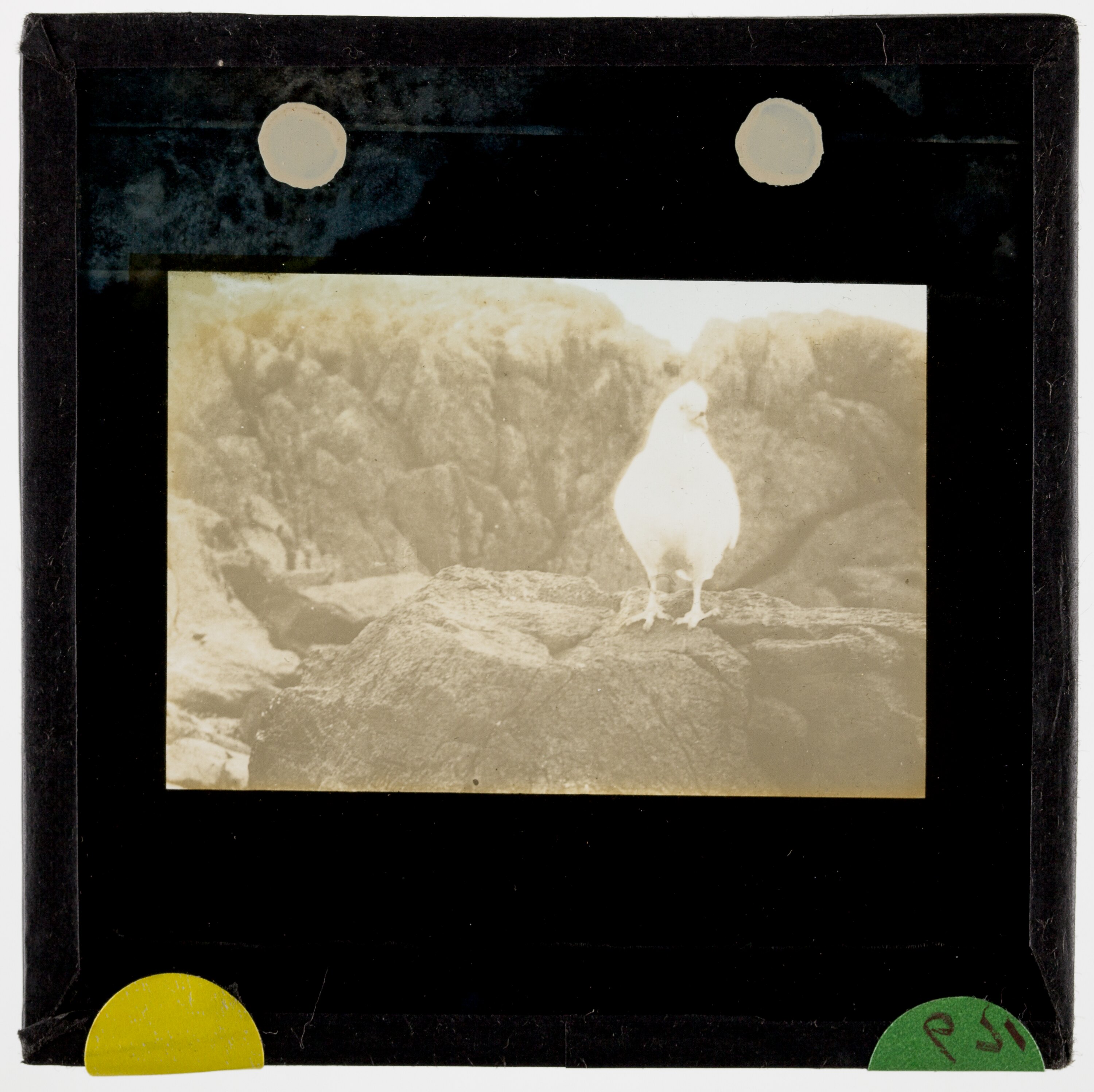 Lantern slide of Snowy Sheathbill or Paddy on the rock shelf on Kerguelen Island, Sub-Antarctic.