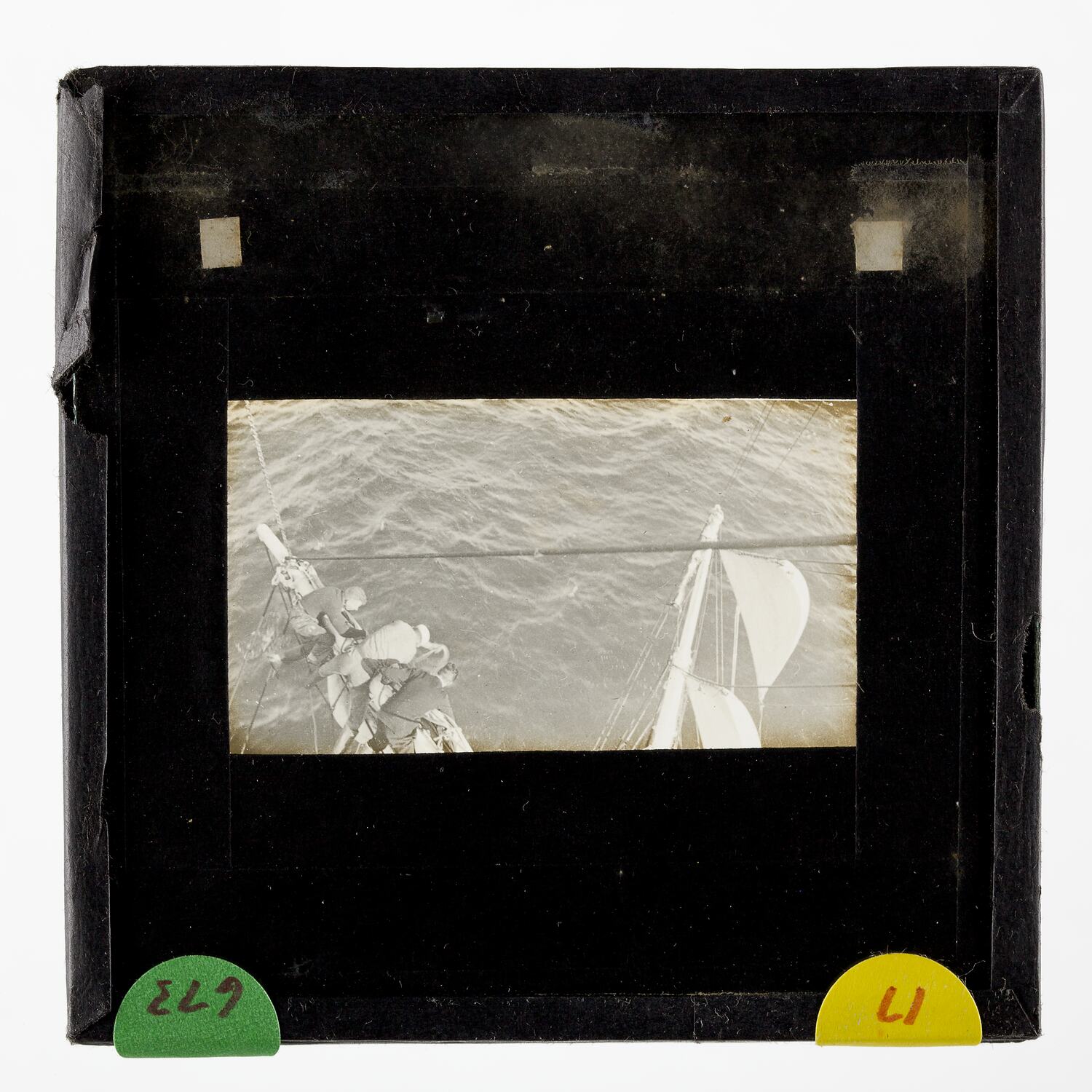 Lantern slide of sailors out on the boom aboard the ship Discovery in Antarctica.
