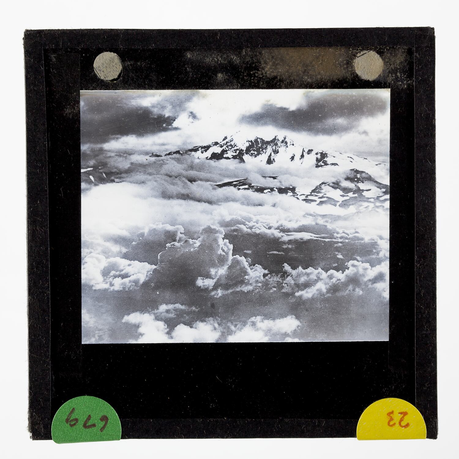 Lantern slide of an aerial view of Mount Ross, the highest peak - 6,000 feet above sea level - on Kerguelen Island, sub- Antarctica.