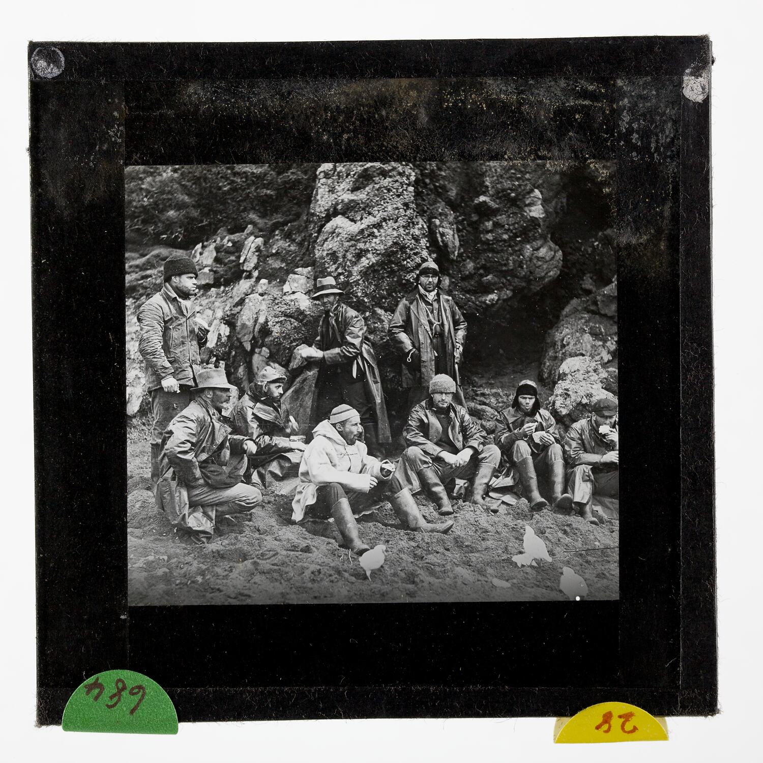 Lantern slide of a scientific party from the Discovery on Crozet Islands.