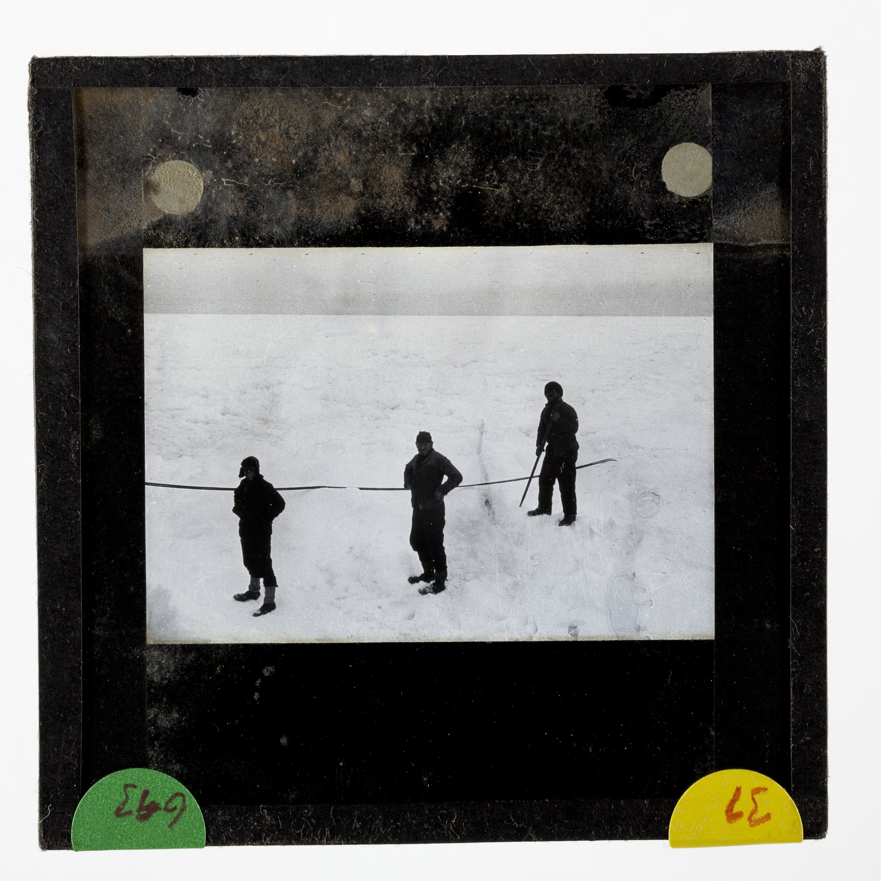 Lantern slide of three explorers in Antarctica.
