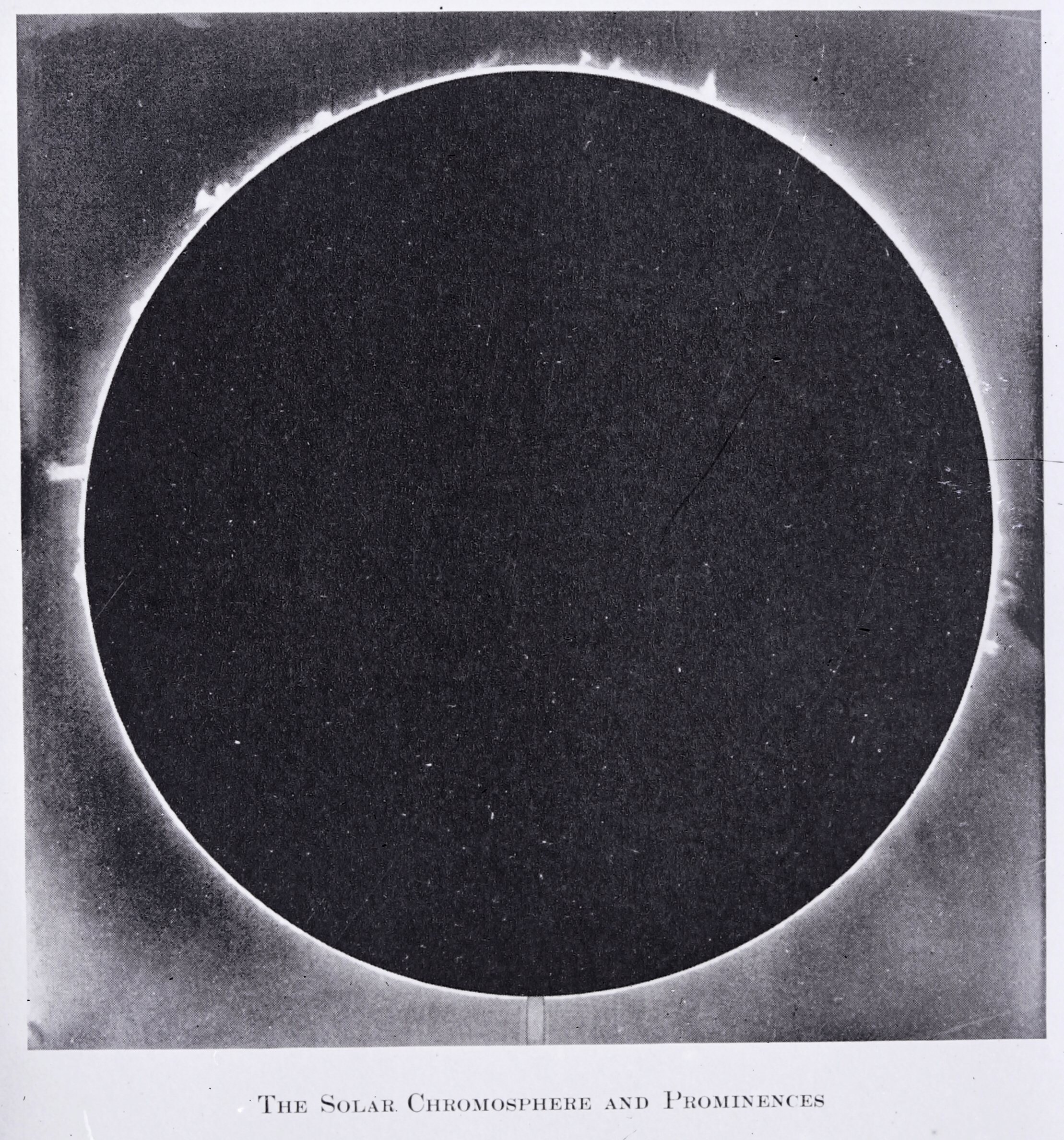 Glass slide of an image of the solar chromosphere and solar prominences, reproduced from a book or article. It is part of a collection of eighteen astronomical black and white photographic lantern slides and glass negatives.