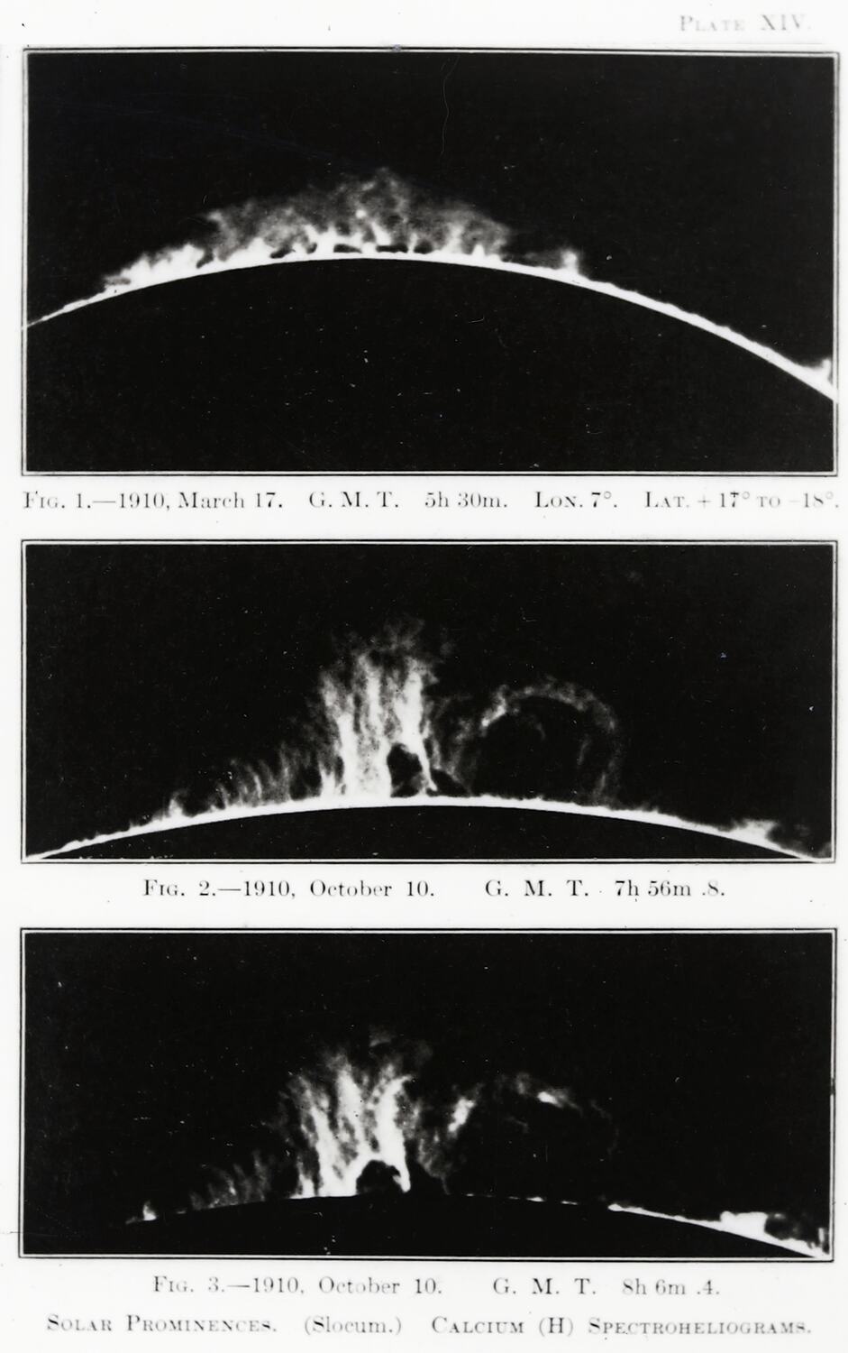 Hand written in black ink on a white label attached to glass: '198' Text printed below images in negative: 'FIG. 1. - 1910, March 17. G. M. T. 5h 30m. LON. 7°. LAT. + 17° TO 18°. / FIG. 2. - 1910, October 10. G. M. T. 7h 56m .8. / FIG. 3. - 1910, October 10. G. M. T. 8h 6m .4. / SOLAR PROMINENCES (Slocum.) CALCIUM (H) SPECTROHELIOGRAMS.'