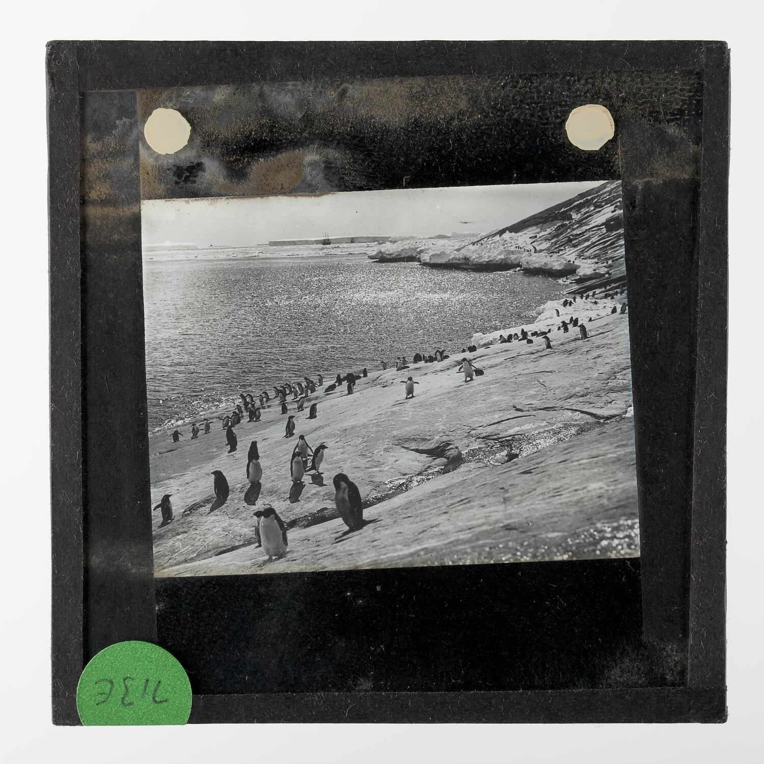 Adelie Penguins along the slopes of Proclamation Island and Icebergs in the far distance. Eric Douglas said 'Adelie Penguins sun baking on the slopes of Proclamation Rock'. Although this land feature became 'Proclamation Island' it had just been discovered and at this early stage to call it Proclamation Rock was quite acceptable. Photograph taken during the British Australian New Zealand Antarctic Research Expedition (BANZARE), Voyage 1.