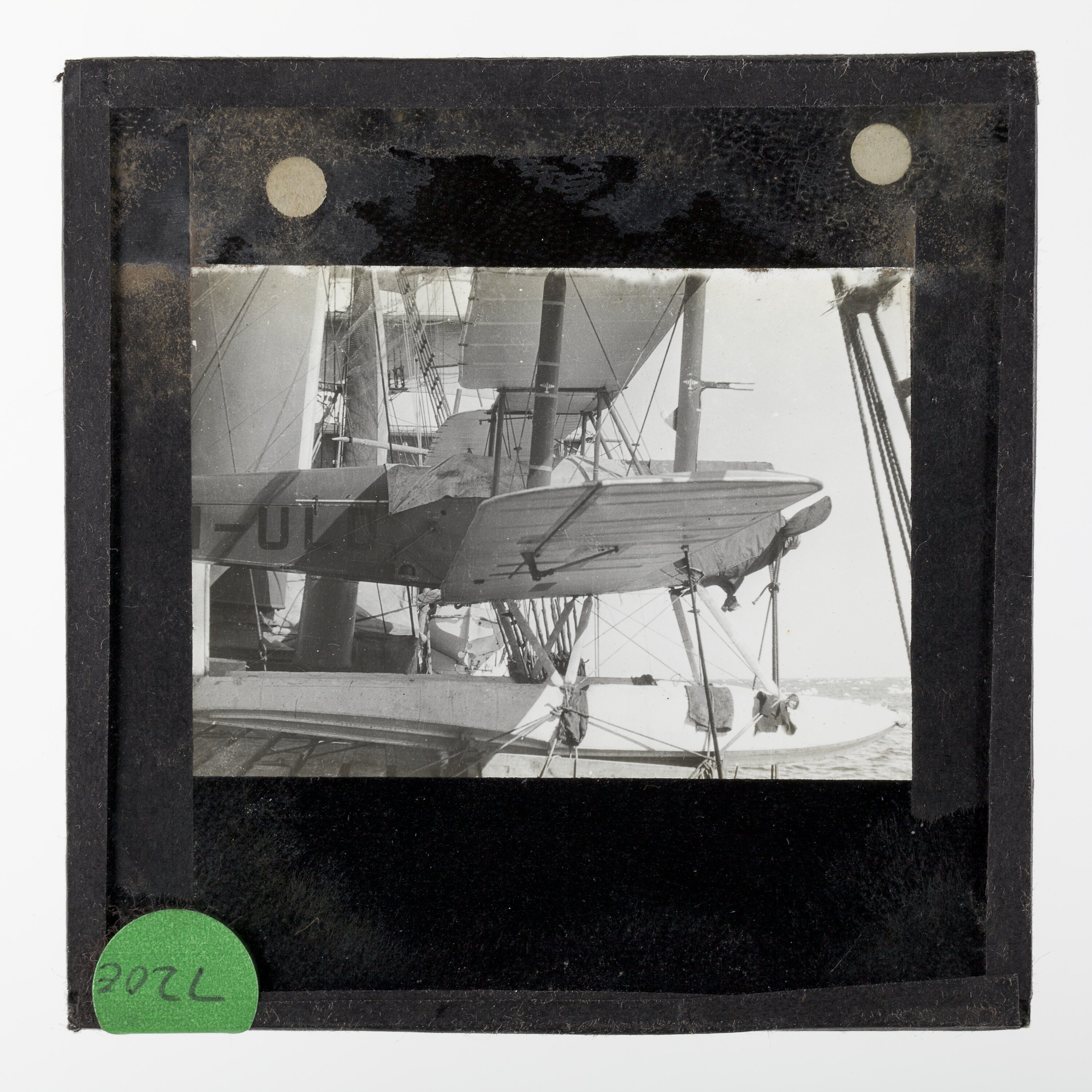Lantern slide of the de Havilland DH60G Gipsy Moth seaplane aboard the ship Discovery I.