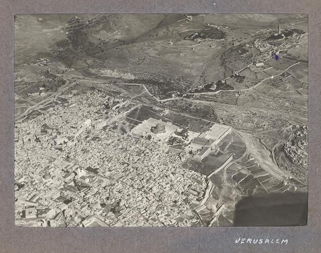 One of an album of 24 black and white photographs of the Middle East during World War I, probably taken by Australian Flying Corps photographer Norman Henry Clutterbuck, the maternal uncle of the previous owner Ray Kerby. The album mostly contains aerial photographs of locations around the Middle East including Jerusalem, Jericho, Gaza and Jaffa some of which appear to be duplicates of photographs found in the war diaries of the No. 1 Squadron, Australian Flying Corps, held at the Australian War Memorial. The album ST 41221, from the same source, contains copies of some of the images included in this album.