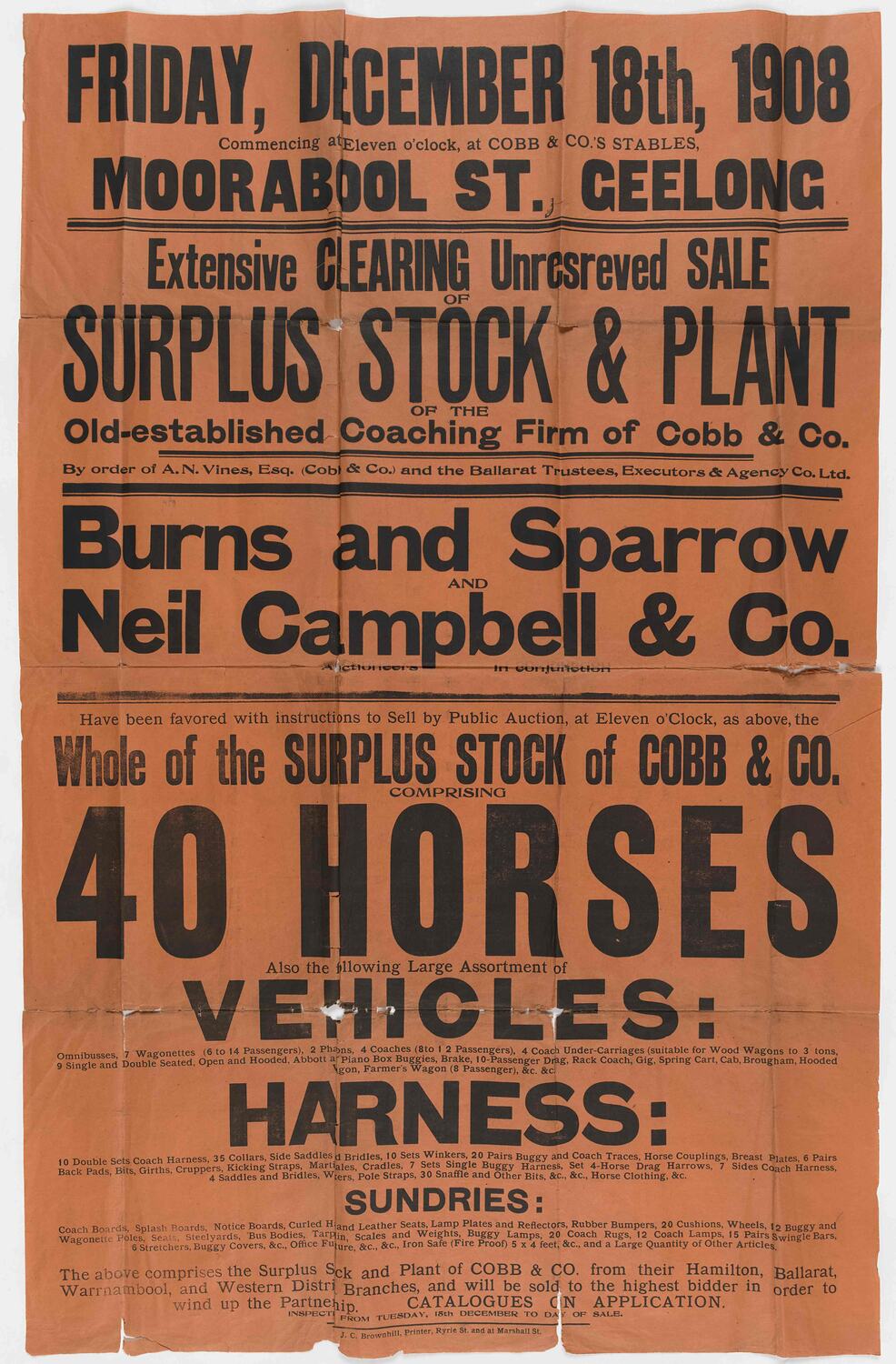 Printed: FRIDAY, DECEMBER 18th, 1908 / Commencing at Eleven o'clock, at COBB & CO.'S STABLES, / MOORABOOL ST. GEELONG / Extensive CLEARING Unresreved [sic] SALE / SURPLUS SYOCK & PLANT / OF THE / Old-established Coaching Firm of Cobb & Co. / By order of A.N. Vines, Esq. (Cobb & Co.) and the Ballarat Trustees, Executors & Agency Co. Ltd. / Burns and Sparrow / and / Neil Campbell & Co. / Auctioneers In conjunction / Have been favoured with instructions to Sell by Public Auction at Eleven o'Clock, as above, the / Whole of the SURPLUS STOCK of COBB & CO. / COMPRISING / 40 HORSES / Also the following Large Assortment of / VEHICLES: / Omnibusses, 7 Wagonettes (6 to 14 Passengers), 2 Phaetons, 4 Coaches (8to 12 Passengers), 4 Coach Under-Carriages (suitable for Wood Wagons to 3 tons, / 9 Single and Double Seated, Open and Hooded, Abbott and Piano Box Buggies, Brake, 10-Passenger Drag, Rack Coach, Gig, Spring Cart, Cab, Brougham, Hooded / Wagon, Farmer's Wagon (8 Passenger), &c. &c. / HARNESS: / 10 Double Sets Coach Harness, 35 Collars, Side Saddles and Bridles, 10 Sets Winkers, 20 Pairs Buggy and Coach Traces, Horse Couplings, Breast Plates, 6 Pairs / Back Pads, Bits, Girths, Cruppers, Kicking Straps, Martingales, Cradles, 7 Sets Single Buggy Harness, Set 4-Horse Drag Harrows, 7 Sides Coach Harness, / 4 Saddles and Bridles, Winkers, Pole Straps, 30 Snaffle and Other Bits, &c., &c., Horse Clothing, &c. / SUNDRIES: / Coach Boards, Splash Boards, Notice Boards, Curled Hair and Leather Seats, Lamp Plates and Reflectors, Rubber Bumpers, 20 Cushions, Wheels, 12 Buggy and / 6 Stretchers, Buggy Covers, &c., Office Furniture, &c., &c., Iron Safe (Fire Proof) 5 x 4 feet, &c., and a Large Quantity of Other Articles. / The above comprises the Surplus Stock and Plant of COBB & CO. From their Hamilton, Ballarat, Warrnambool and Western District Branches, and will be sold to the highest bidder in order to / wind up the Partnership. CATALOGUES ON APPLICATION. / INSPECTION FROM TUESDAY, 15th DECEMBER TO DAY OF SALE. / J. C. Brownhill, Printer, Ryrie St. and at Marshall St.