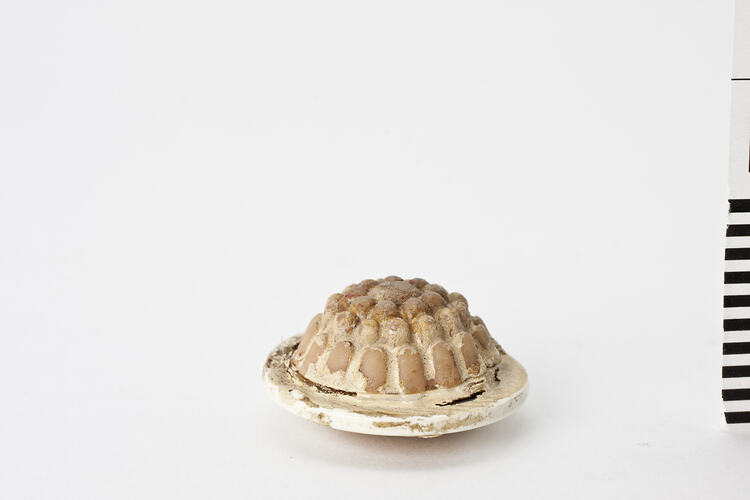 Moulded jelly on a round plate from Room 6 - Kitchen, Basement Central Section, Pendle Hall. From table at left side wall.