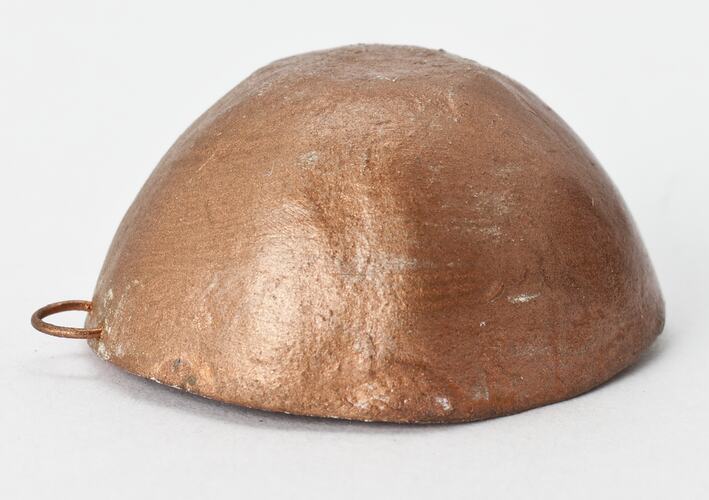 Copper coloured pot. Thin wire handle on one side.