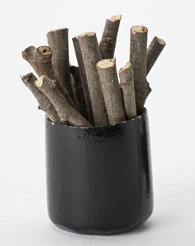 Round, black wooden container with fire wood.