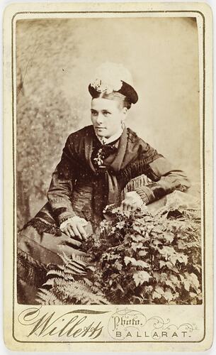 Printed in gold ink below photograph: 'Willetts / Photo. / BALLARAT.' Printed in gold ink on the back of card: 'From the / Photographic Studio / OF G. Willetts. / Bridge St. Ballarat. / BY APPOINTMENT / TO HIS EXCELLENCY THE GOVERNOR. / DUPLICATE COPIES BY SENDING NAME. / F.W.NIVEN' Handwritten in blue ink on the back of card: '15542'