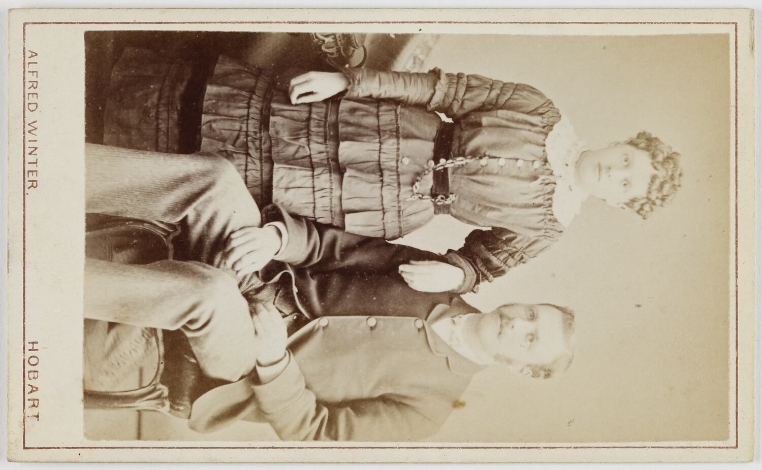 Printed in brown ink on card below photograph: 'ALFRED WINTER. / HOBART' Printed in brown ink on the back of card: 'BY APPOINTMENT / TO HIS EXCELLENCY THE / GOVERNOR / Alfred Winter / Photographer / LIVERPOOL STREET / HOBART / TASMANIA / A LARGE VARIETY OF TASMANIAN VIEWS. / Marion, Imp. Paris' Hand written in black ink on the back of card: 'Silas, Crocker, / 25 yrs age / Harriett, Sarah, 16 yrs age / 1884'