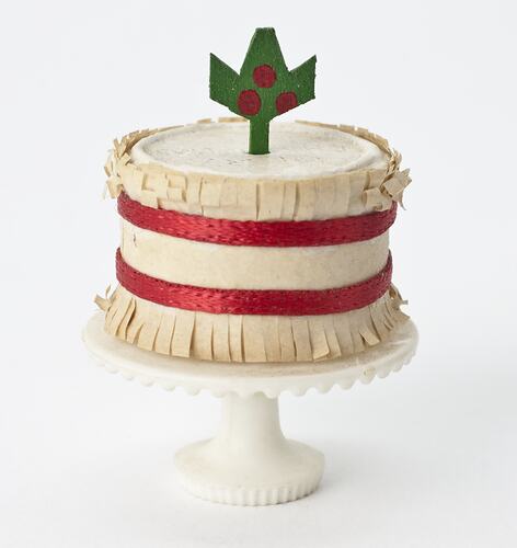Round iced cake on a round plastic cake stand. Red ribbons around cake. Small green decoration on top of cake. Cake stand has a decorative edge.