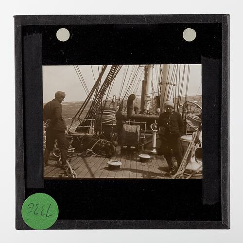 Lantern slide of Eric Douglas [left] and Arthur Max Stanton, on the forecastle head of the Discovery.
