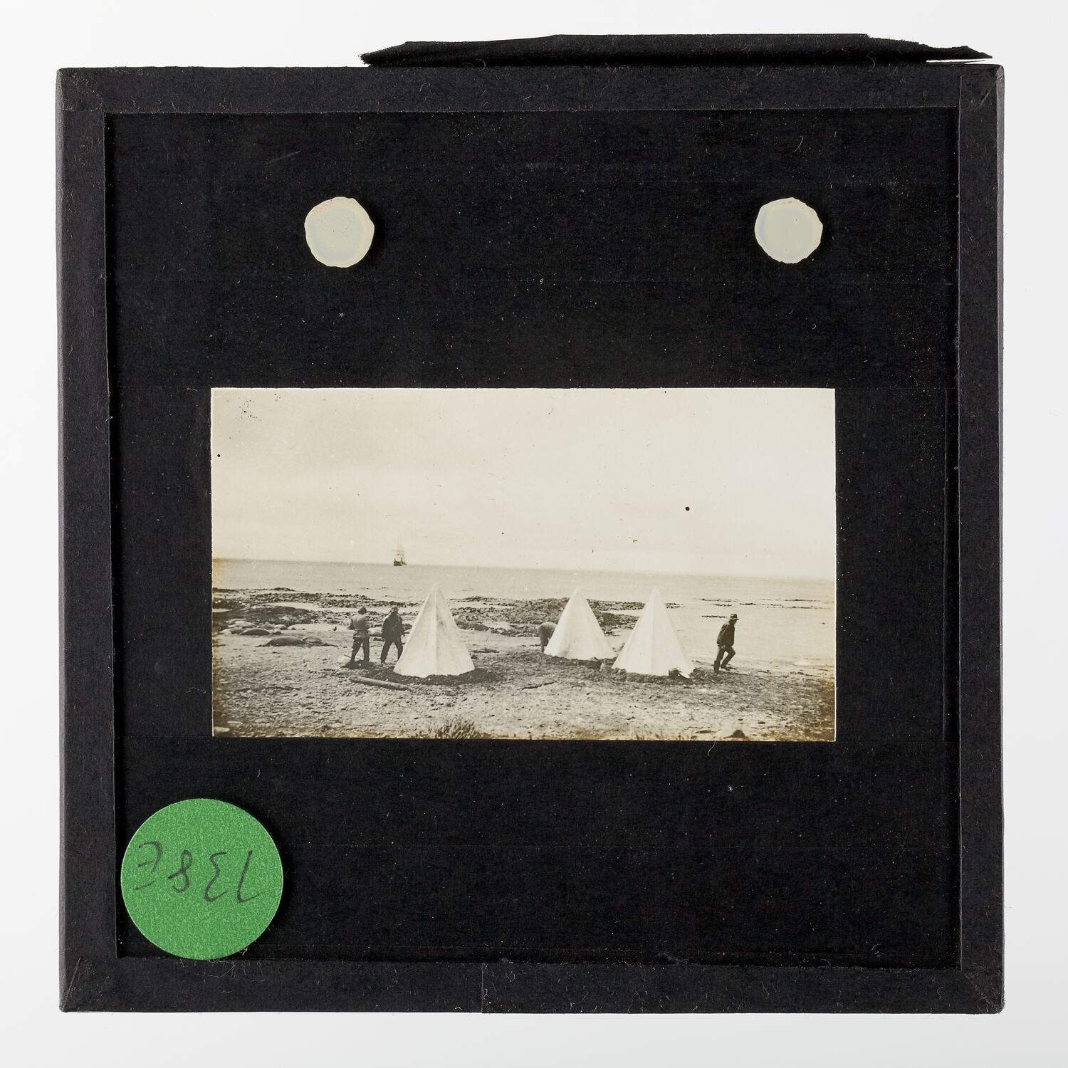 Standard format lantern slide, consisting of two glass sheets each 3.25 x 3.25 ins (83 x 83mm), one pane bearing a positive transparent image and the other pane protecting the image. Sealed with paper binding strips around the four edges of the lantern slide and internally framed with a black cut-out window mask.