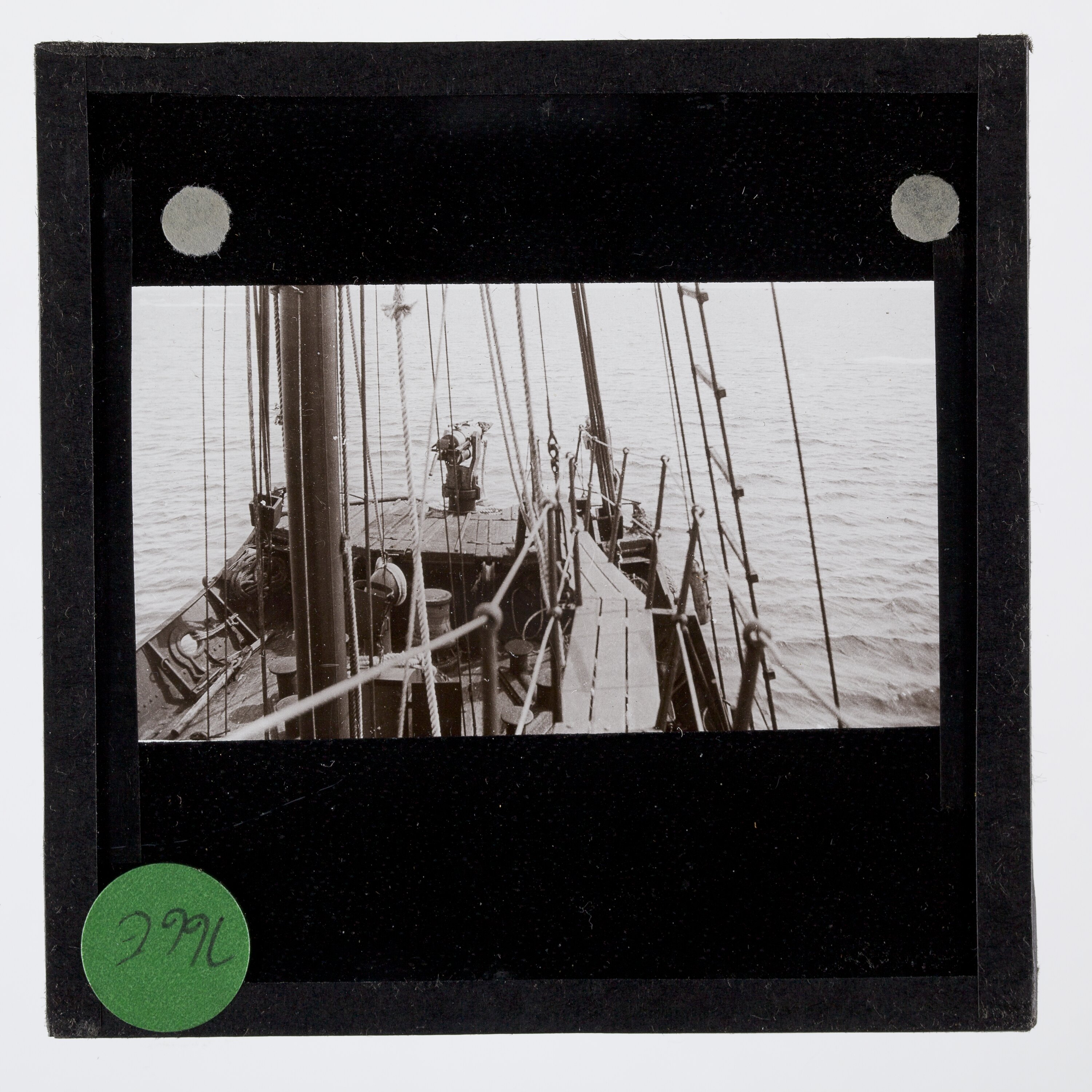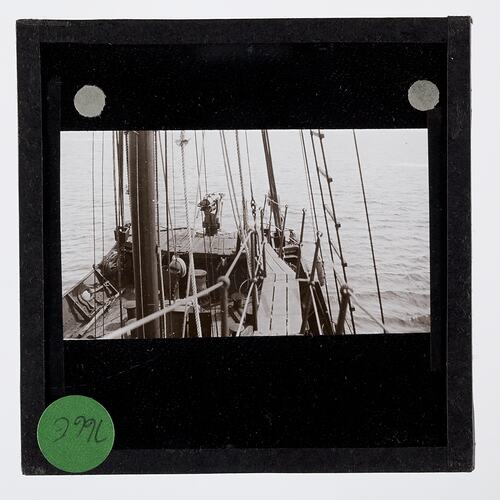 Standard format lantern slide, consisting of two glass sheets each 3.25 x 3.25 ins (83 x 83mm), one pane bearing a positive transparent image and the other pane protecting the image. Sealed with paper binding strips around the four edges of the lantern slide and internally framed with a black cut-out window mask.