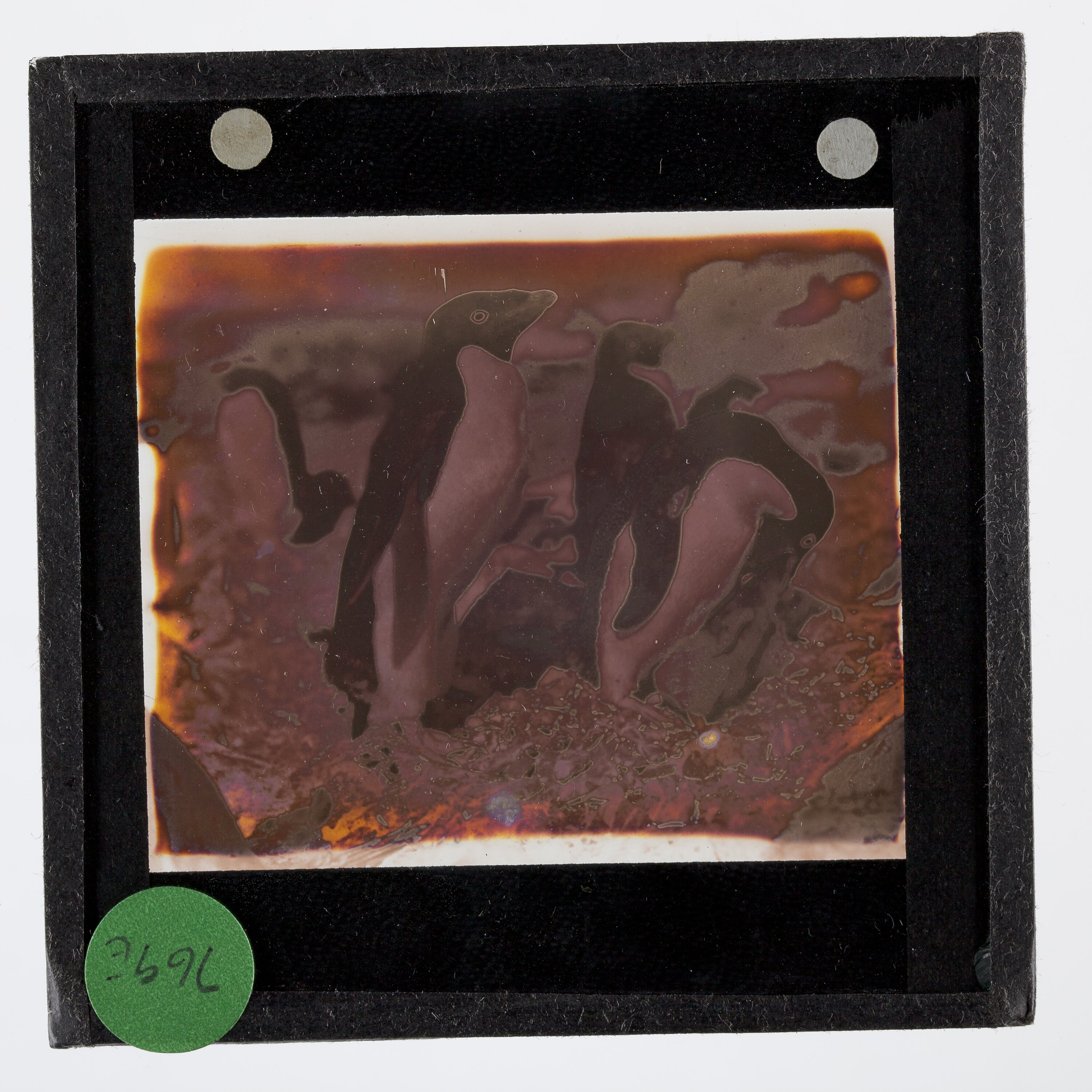 Lantern slide of Adelie Penguins at Cape Denison, Antarctica.