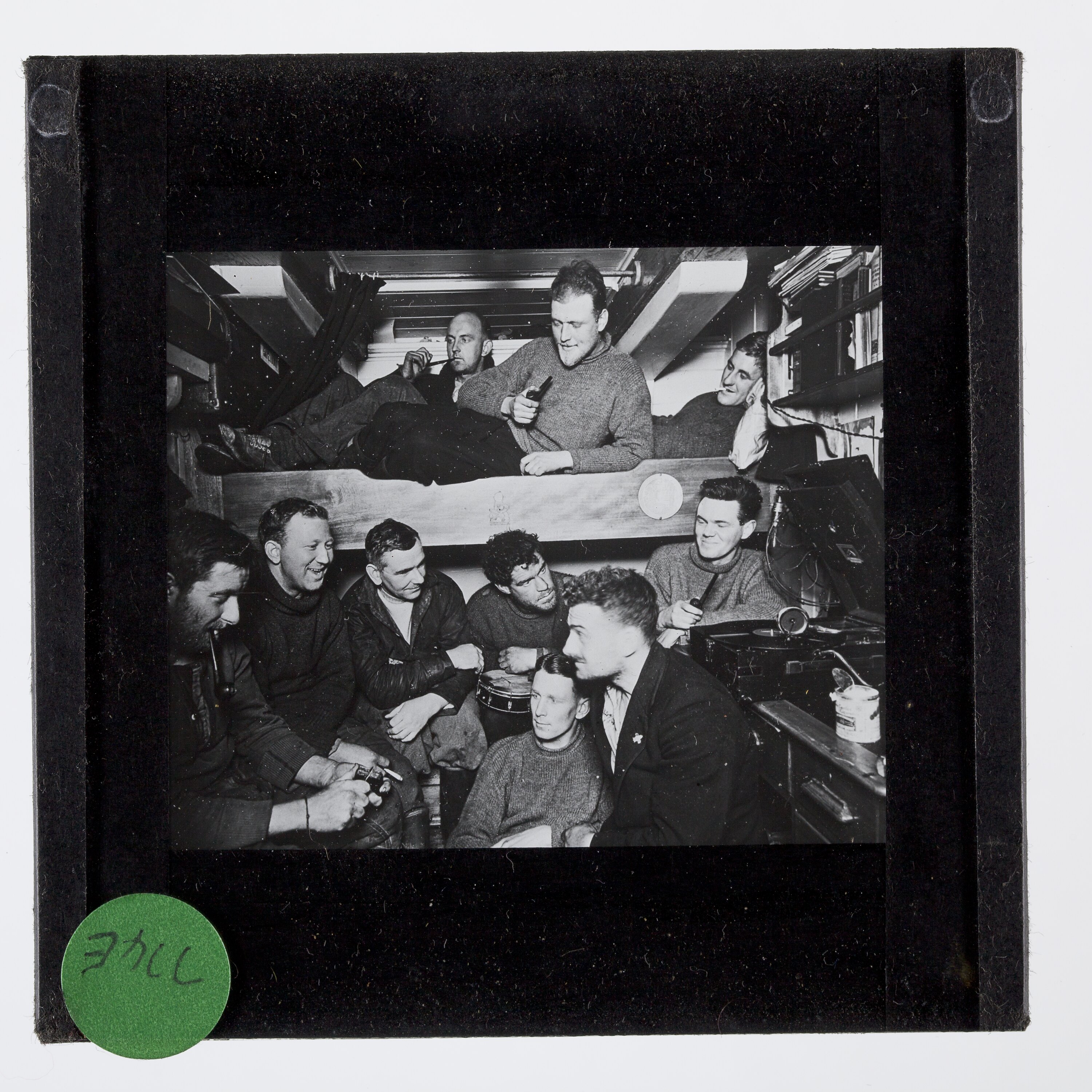 Lantern slide of explorers on the ship Discovery, Antarctica.