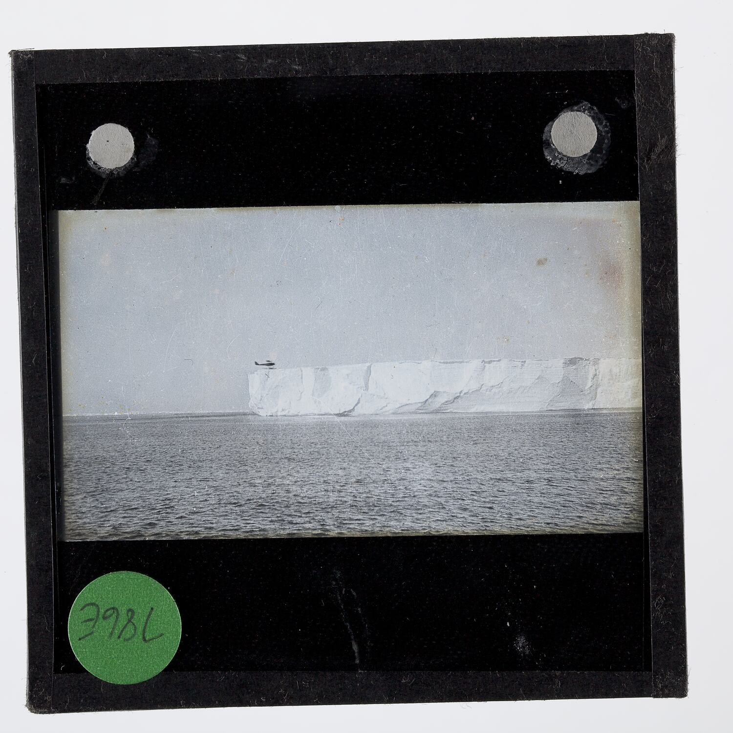 Lantern slide of the De Havilland Gipsy Moth VH-ULD from the ship Discovery over a tabular iceberg, possibly just touching down or skimming the surface as a trial for an emergency landing on the berg.