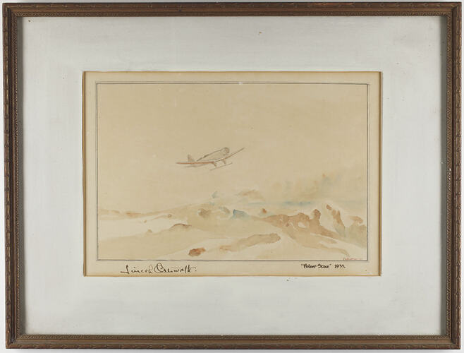 Water colour painting of Lincoln Ellsworth's Northrop Gamma aeroplane the 'Polar Star' flying over the Antarctic plateau. The painting was by Sydney Austin Bainbridge a Crew Member and the Purser on the Discovery II. This painting was signed by Lincoln Ellsworth in January, 1936. It was presented by the artist to Flight Lieutenant Eric Douglas, leader of the RAAF party on the Discovery II during the time of the search for the American Polar Explorer Lincoln Ellsworth and his Canadian based pilot Herbert Hollick-Kenyon. Ellsworth and Hollick-Kenyon were missing on a trans-Antarctic flight in Ellsworth's 'Polar Star'. The missing pair were found alive in January, 1936. Ellsworth Relief Expedition of 1935-1936.