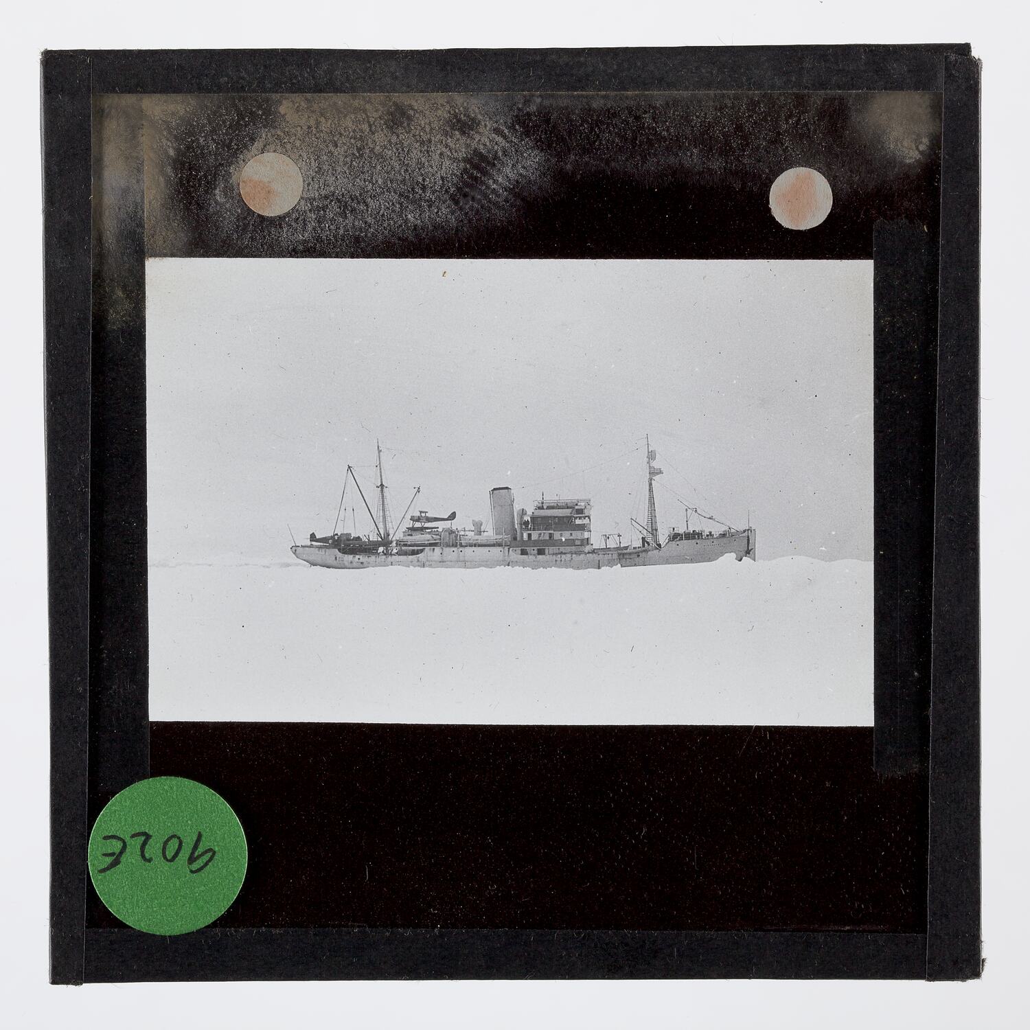 Lantern slide of the Discovery II in pack ice, Antarctica.