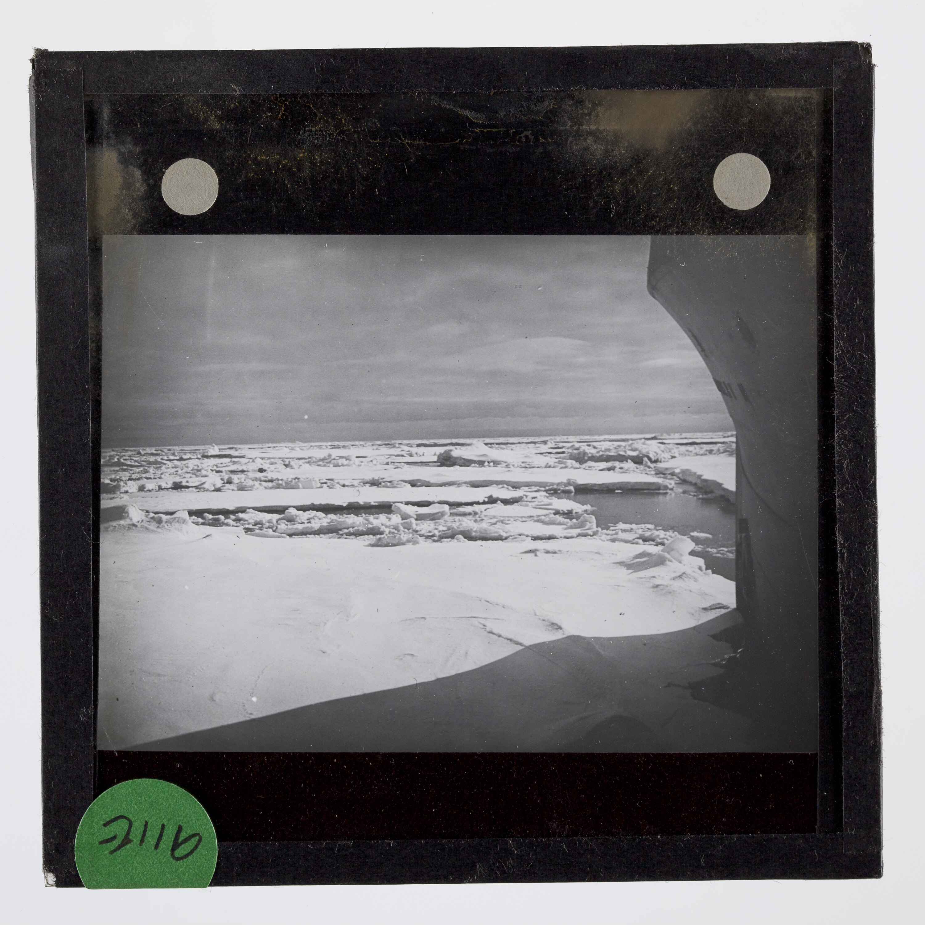 Lantern slide of the expedition ship Discovery II in pack ice, Southern Ocean, Antarctica. Records [Te Papa Museum] indicate that the position of the ship was '...Latitude 72 degrees South'.