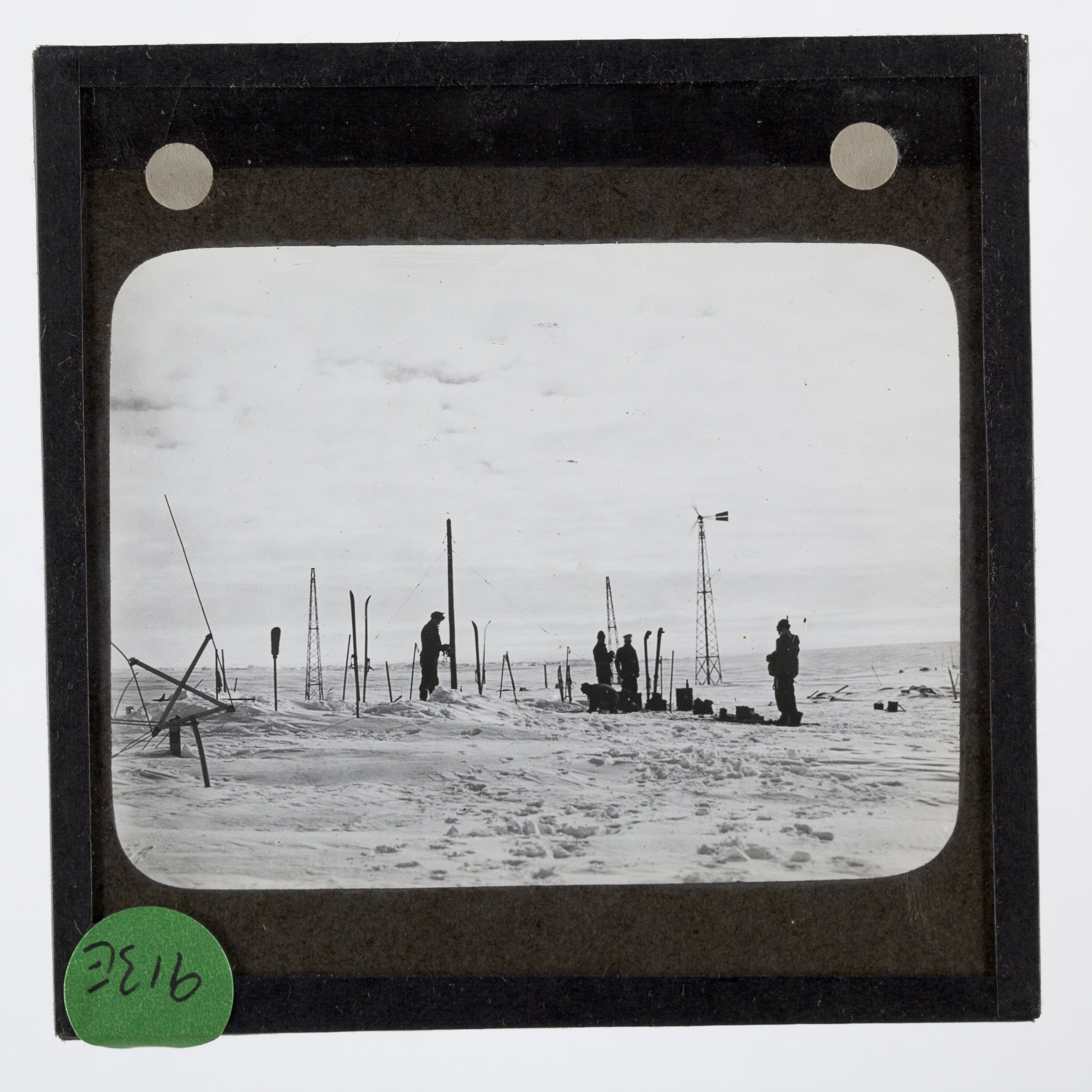 Lantern slide of the Discovery II rescue party at Little America, Antarctica.