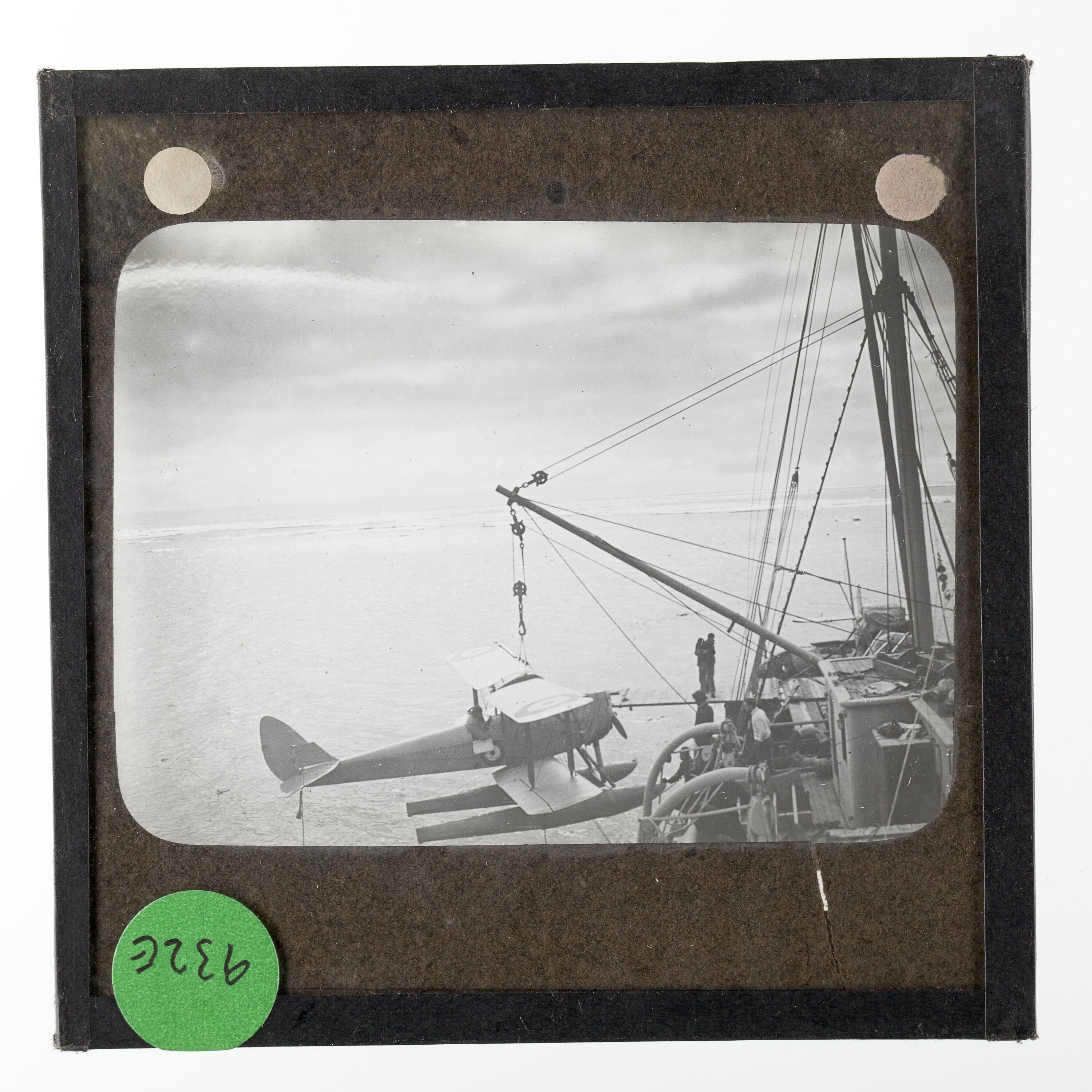 Lantern slide of the Gipsy Moth DH60X on the lifting hook of the Discovery II, Antarctica.
